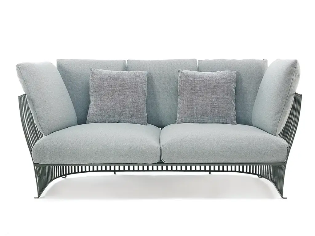 Lisa Sofa Filò is a 2 seater garden sofa with braided back in nautical rope and removable cushions covered with Sunbrella® fabric. The nautical rope is 100% recyclable polyester, dope-dyed, non-toxic, resistant and easy to maintain.Sledge frame in zinc and polyester powder coated tubular steel. Removable cushion with zip. The frame, braiding and cushions are 100% demountable for a correct recycling process.Padding (seat cushions): non-deformable polyurethane foam (density 25 kg/m³) + polyester fibre sheet (density 500 g/m²), covered with 100% water-repellent SprayTest polyester fabric coupled with polyester fibre (density 200 g/m²).Covering (seat cushions): 100% Sunbrella® water-repellent and stain-resistant mass-dyed acrylic fabric. With straps for fastening to the seat with press studs.Padding (backrest cushions): polyester staple covered with 100% water-repellent SprayTest polyester fabric coupled with polyester fibre (density 200 g/m²).Covering (backrest cushions): 100% Sunbrella® water-repellent and stain-resistant mass-dyed acrylic fabric (98% Sunbrella acrylic, 2% other, only for C0 fabric).Padding (optional lower back cushions): polyester staple covered with 100% water-repellent SprayTest polyester fabric coupled with polyester fibre (density 200 g/m²).Covering (optional lower back cushions): 100% Sunbrella® water-repellent and stain-resistant mass-dyed acrylic fabric.The metal sled frame guarantees its sturdiness and stops it from sinking into the grass. The plump cushions provide a cosy place to sit whilst ensuring excellent resistance to bad weather and long-lasting durability. The range of colours is a nod at fresh summer shades. Lisa reflects the sophisticated tone that infused interior decor in the ‘50s and ‘60s. Its shape inspires a sense of reassuring warmth, retro charm and memories of home. The enveloping and comfortably upholstered seatback and seat make Lisa the ideal complement to a living room or contract setting. The lightweight but strong metal structure heightens the visual sense of lightness. Lisa comes in two versions: chair, armchair and stool.