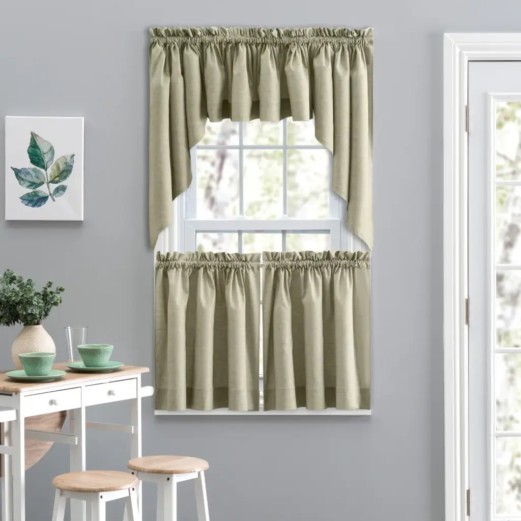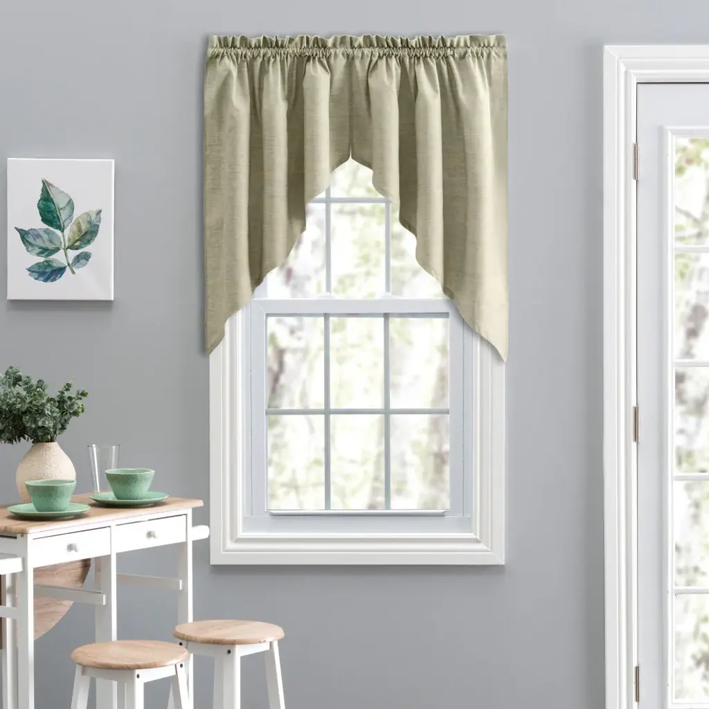 A stunning textured solid that is both relaxed and refined. Beautifully coordinates with any pattern. The tailored swag valance is made with 50-percent polyester/50-percent cotton duck fabric that creates a smooth draping effect, soft texture and easy maintenance. Each swag piece is constructed with a 1.5-inch header and 1.5-inch rod pocket. Sold in pairs (2 pieces) width measures 56-inches (both 28-inch panels together), while length measures 36-inches from top stitch down. For wider windows simply add the coordinating tailored valance to the look. Easy care machine washable.