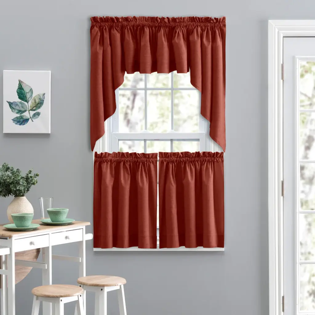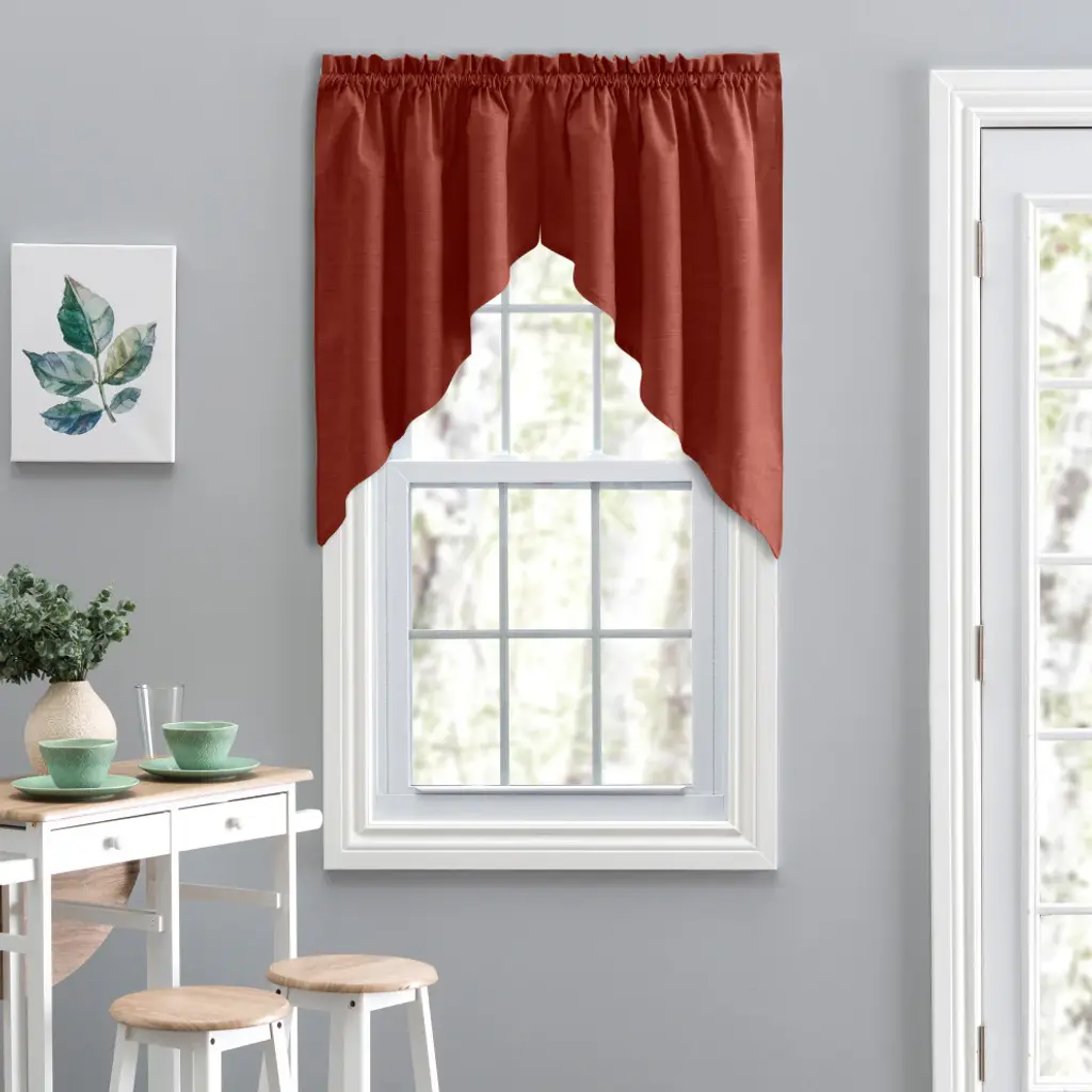 A stunning textured solid that is both relaxed and refined. Beautifully coordinates with any pattern. The tailored swag valance is made with 50-percent polyester/50-percent cotton duck fabric that creates a smooth draping effect, soft texture and easy maintenance. Each swag piece is constructed with a 1.5-inch header and 1.5-inch rod pocket. Sold in pairs (2 pieces) width measures 56-inches (both 28-inch panels together), while length measures 36-inches from top stitch down. For wider windows simply add the coordinating tailored valance to the look. Easy care machine washable.
