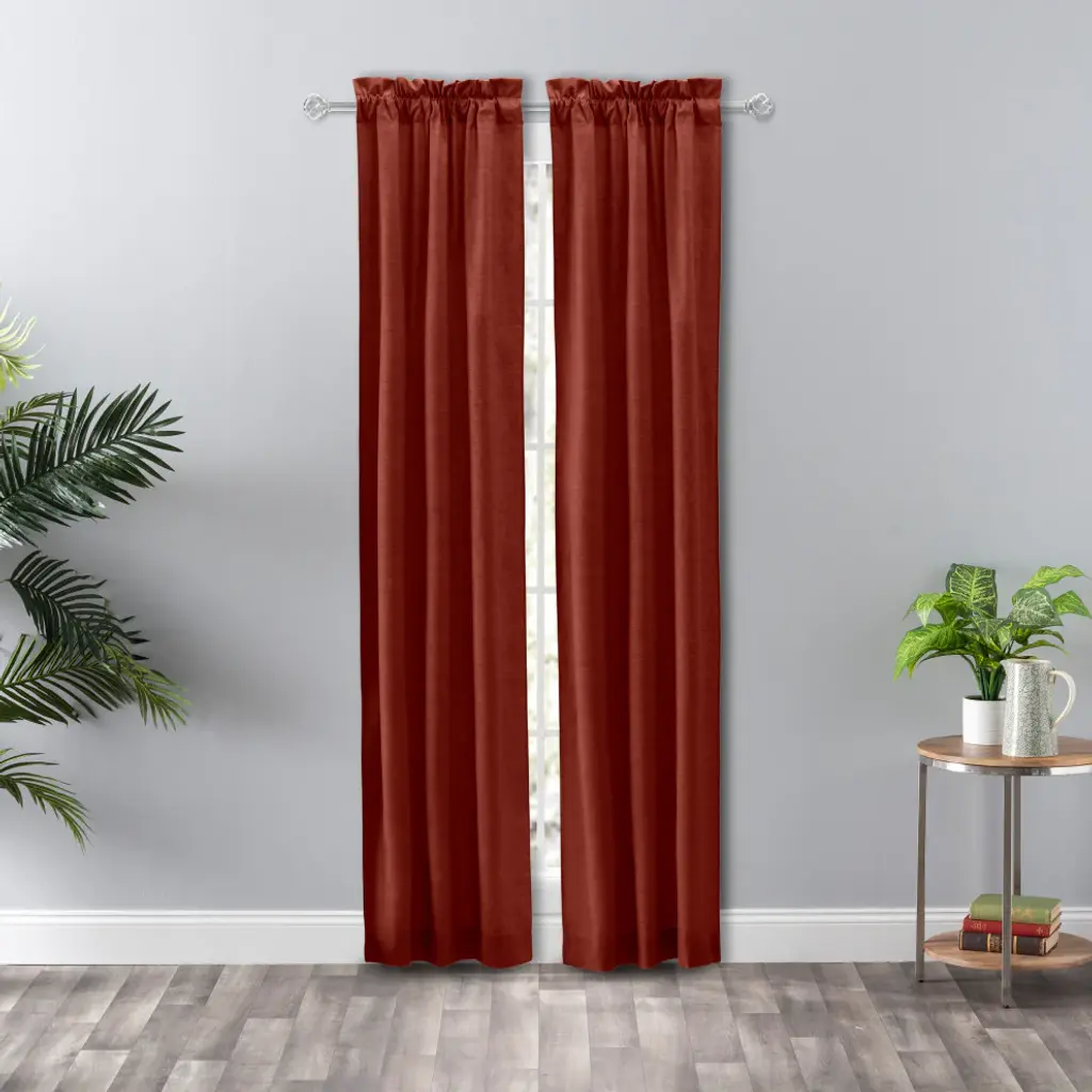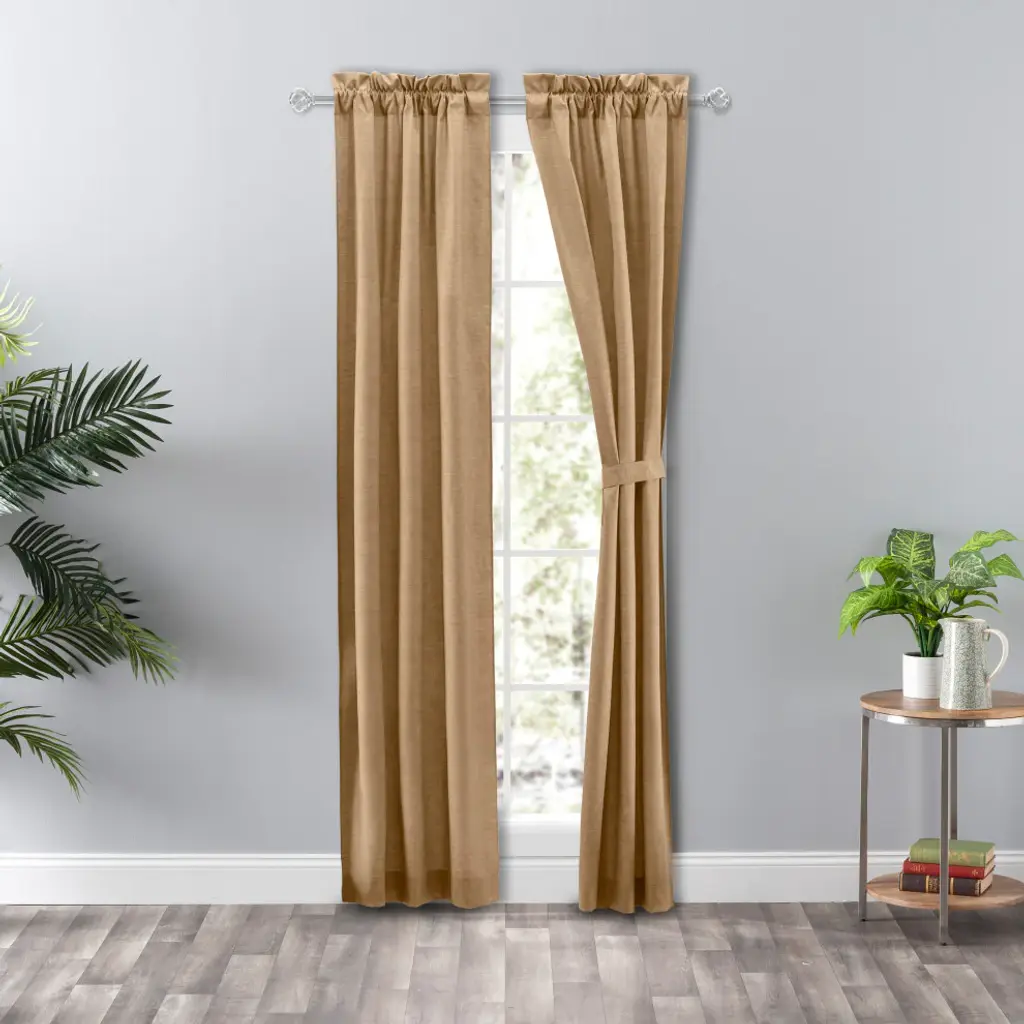 A stunning textured solid that is both relaxed and refined. Beautifully coordinates with any pattern. The tailored panel pair is made with 50-percent polyester/50-percent cotton duck fabric that creates a smooth draping effect, soft texture and easy maintenance. Each curtain panel is constructed with a 1.5-inch header and 1.5-inch rod pocket. Two tiebacks are included for a different look. Width is measured overall 56-inches (both 28-inch panels together), while length is measured at 63-inches. For wider windows simply add multiply panels together. Easy care machine washable.