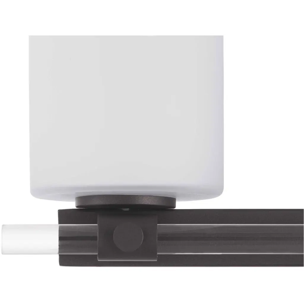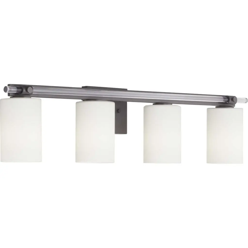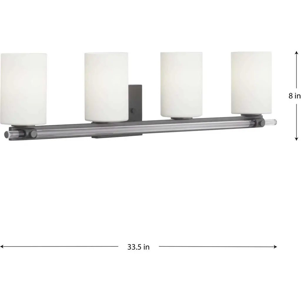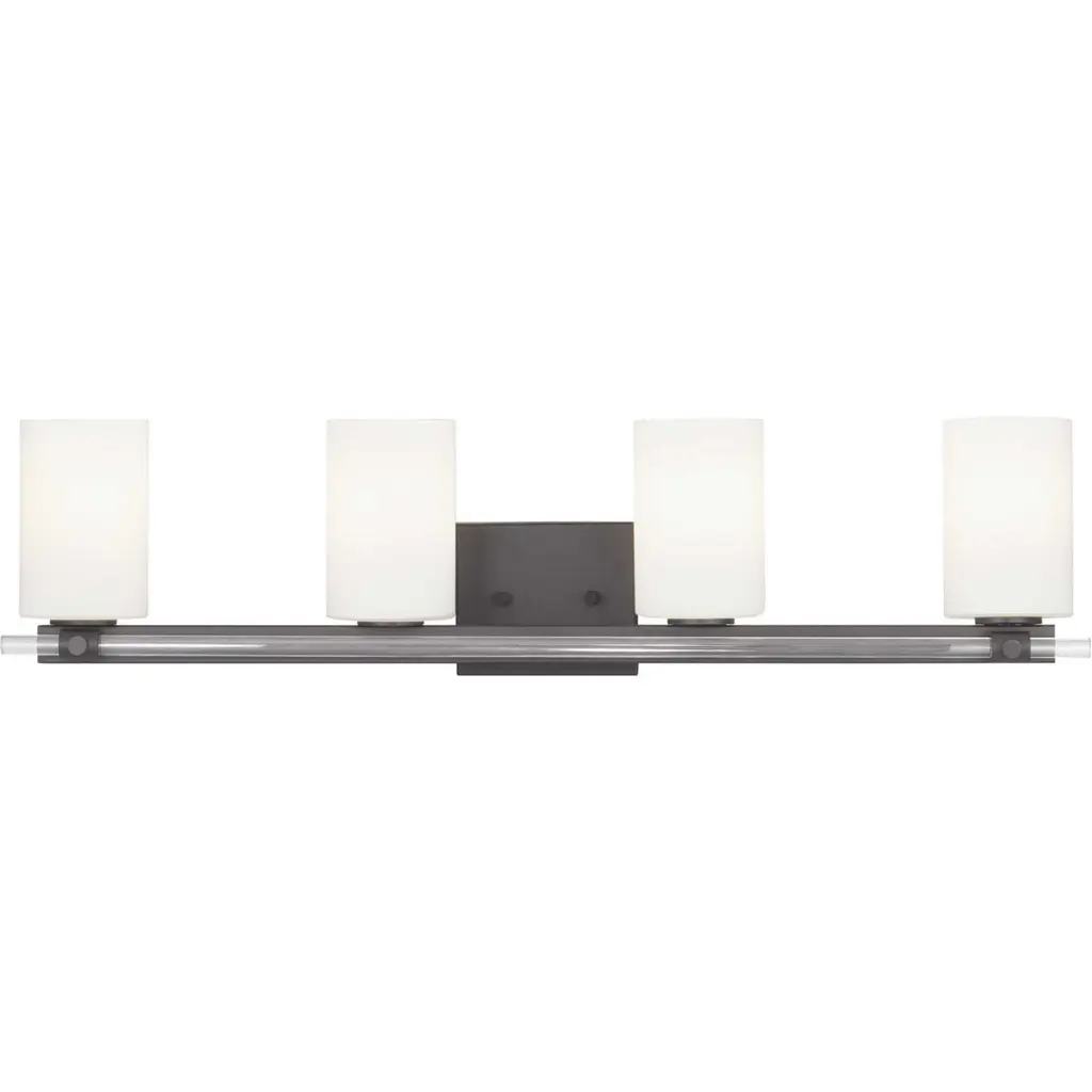 Enjoy high status with a four-light bath and vanity in the Lisbon Collection that is full of femininity, gleam and shine. Etched opal glass shades sit atop an elegant K9 glass rod, highlighted with a Black finish. The highly polished design style complements both Modern and Luxe interiors – and can be mounted up or down.
