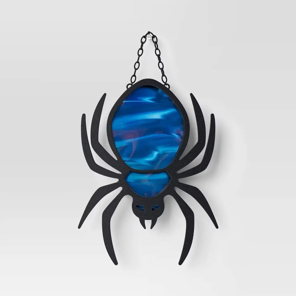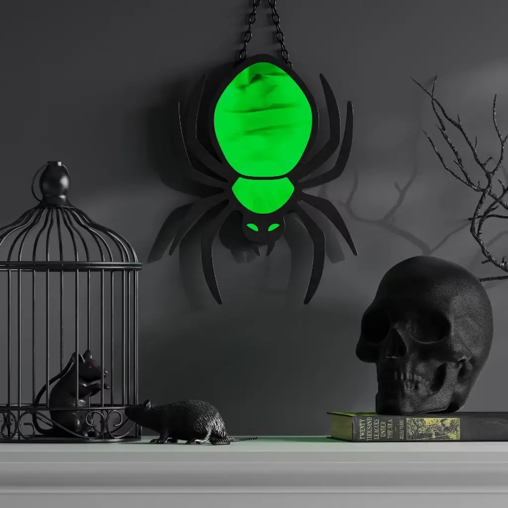Add a pop of frightful charm to your walls with this Spider Lit Iridescent LED Halloween Novelty Silhouette Light from Hyde and EEK! Boutique™. This novelty silhouette light is designed in the shape of a black spider with a blue head and abdomen, featuring 18 LED bulbs that glow in iridescent neon green. Featuring 6 hours on, 18 hours off, and steady on lighting options, this spider silhouette light is intended for indoor use only and has an attached chain loop at the top for easy hanging.Hyde and EEK! Boutique™: Thrilling delights. Curious oddities.
