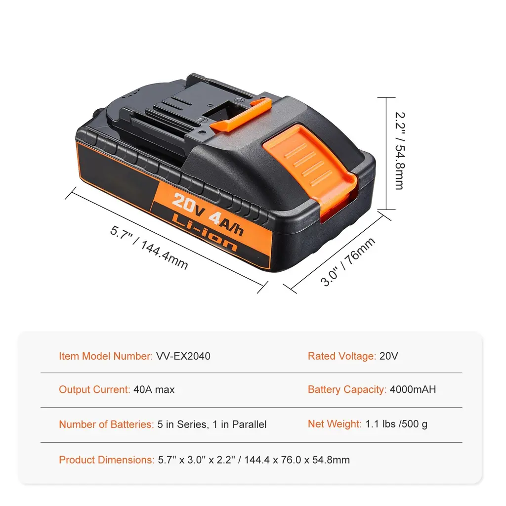 High-Efficiency Battery Pack: Our battery pack provides a robust 20V power output, meeting the diverse needs of our power tools and ensuring the efficient completion of tasks. Durable Battery Life: Equipped with a high-capacity 4000mAh / 2000mAh battery featuring premium cells, this battery pack boasts outstanding endurance, significantly extending work duration and reducing the frequency of recharging. High Output Current Capability: With a maximum output current of 40A / 20A, the battery pack maintains stable power supply even under high-load conditions, making it suitable for a range of high-powered electric tools. Comprehensive Safety Features: The battery pack incorporates multiple safety mechanisms, including overcharge, over-discharge, and short-circuit protection, ensuring the long-term stable and safe operation of your power tools and battery. Extensive Compatibility: As the ideal replacement or upgrade for our 20V cordless power tool batteries, this battery pack significantly enhances the flexibility and versatility of your work. Package Content 1 x Battery Pack