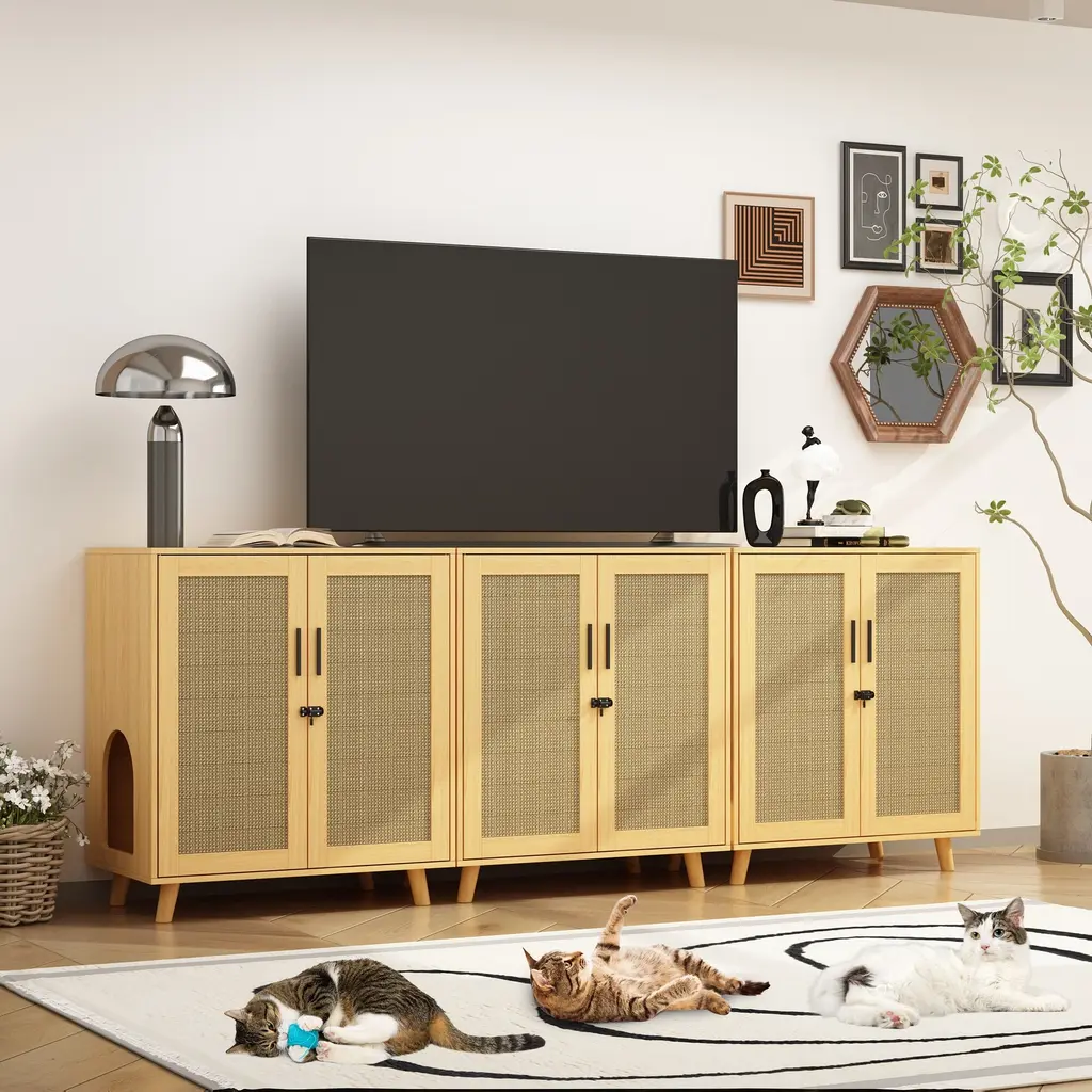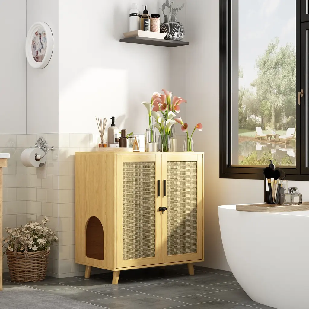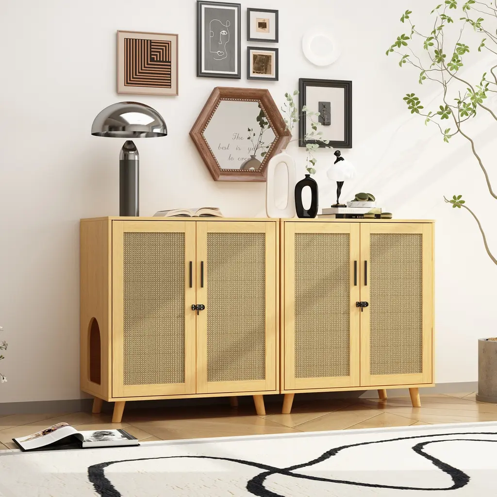 【4-in-1 Multi-Functional Cat House:】This 2-door rattan cabinet serves as a versatile cat house that meets various needs. It not only conceals your cat's litter box but also provides a private and comfortable space for your furry friend. Additionally, it functions as a storage cabinet for pet snacks and toys, as well as a practical side table bathroom cabinet or nightstand that seamlessly blends with your home decor.【A Deep Drawer & Apron Tabletop:】Designed with a spacious tabletop, this cat house allows you to place books, magazines, potted plants, lamps, and other decorative items. The apron design on the tabletop prevents items from accidentally falling off. The cabinet features two doors, providing easy access to most standard litter boxes, while the deep and wide drawer offers ample storage space.【Selected Material and Sturdy Construction:】Crafted from high-quality MDF board with meticulous craftsmanship, this hidden cat washroom is built to last. It is durable, wear-resistant, and resistant to deformation, ensuring it can withstand cats climbing up and down. 【Right Entrance for Great Ventilation:】To prioritize the comfort of your cat, this cat house features a kitty-sized entrance on the right side. It allows your cat to move freely and easily in and out of the house. Moreover, the entrance promotes good ventilation, brings soft light to your cat, and effectively prevents dogs from accessing the litter box furniture.【Easy Setup and Maintenance:】With the detailed instructions provided, assembling this cat litter box enclosure is a breeze, requiring minimal effort and time. The magnetic doors ensure quiet opening and closing, minimizing disturbances. The spray-painted surface is smooth and burr-free, making it easy to clean and maintain the cat house, ensuring a hygienic environment for your feline companion.Experience the perfect combination of functionality and style with this 4-in-1 Multi-Functional Cat House. Create a cozy and private space for your cat while adding a touch of elegance to your home.