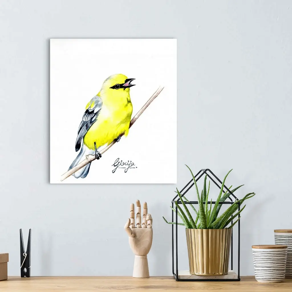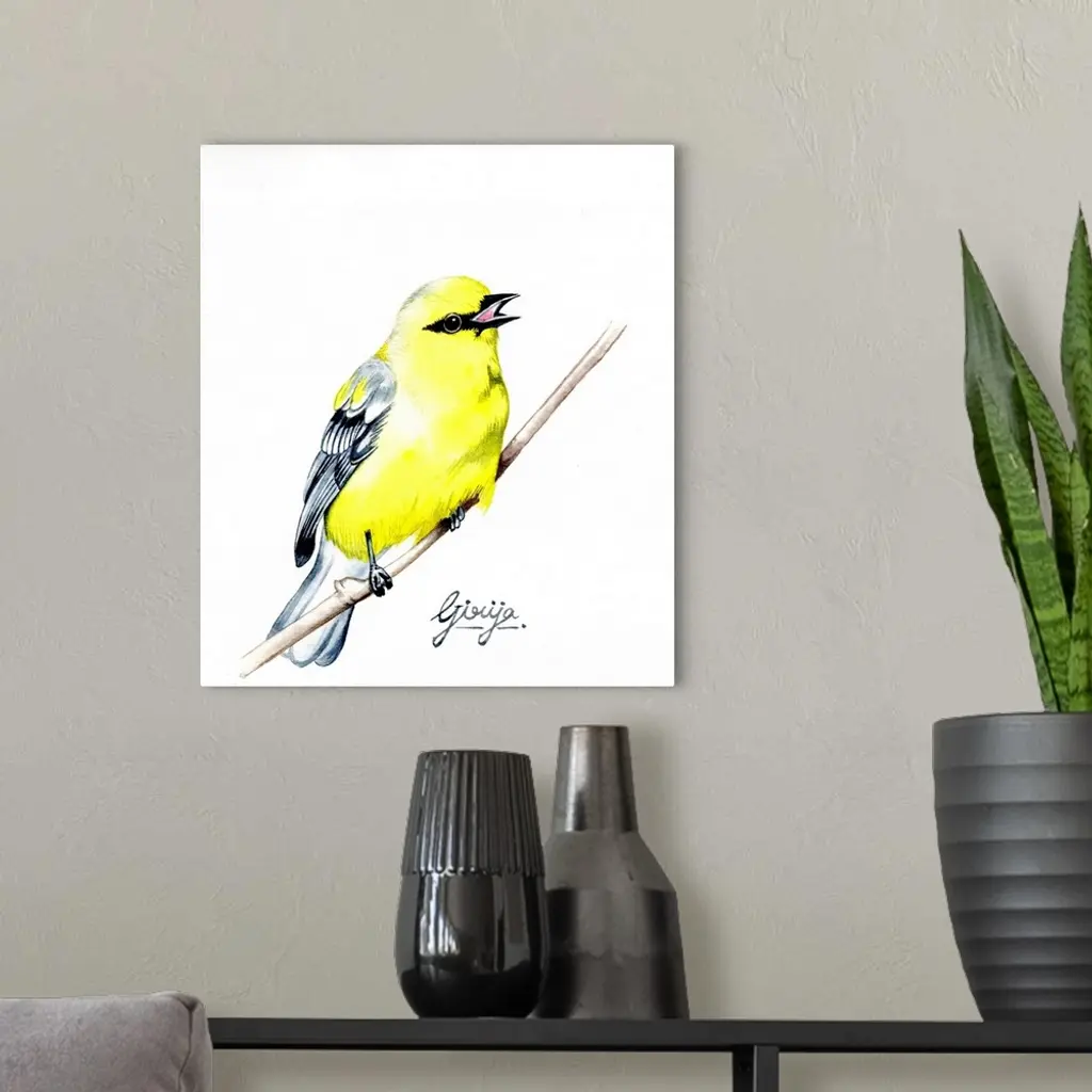 The American goldfinch is a small north American bird in the finch family. This bright yellow colored bird is painted in watercolor on paper.