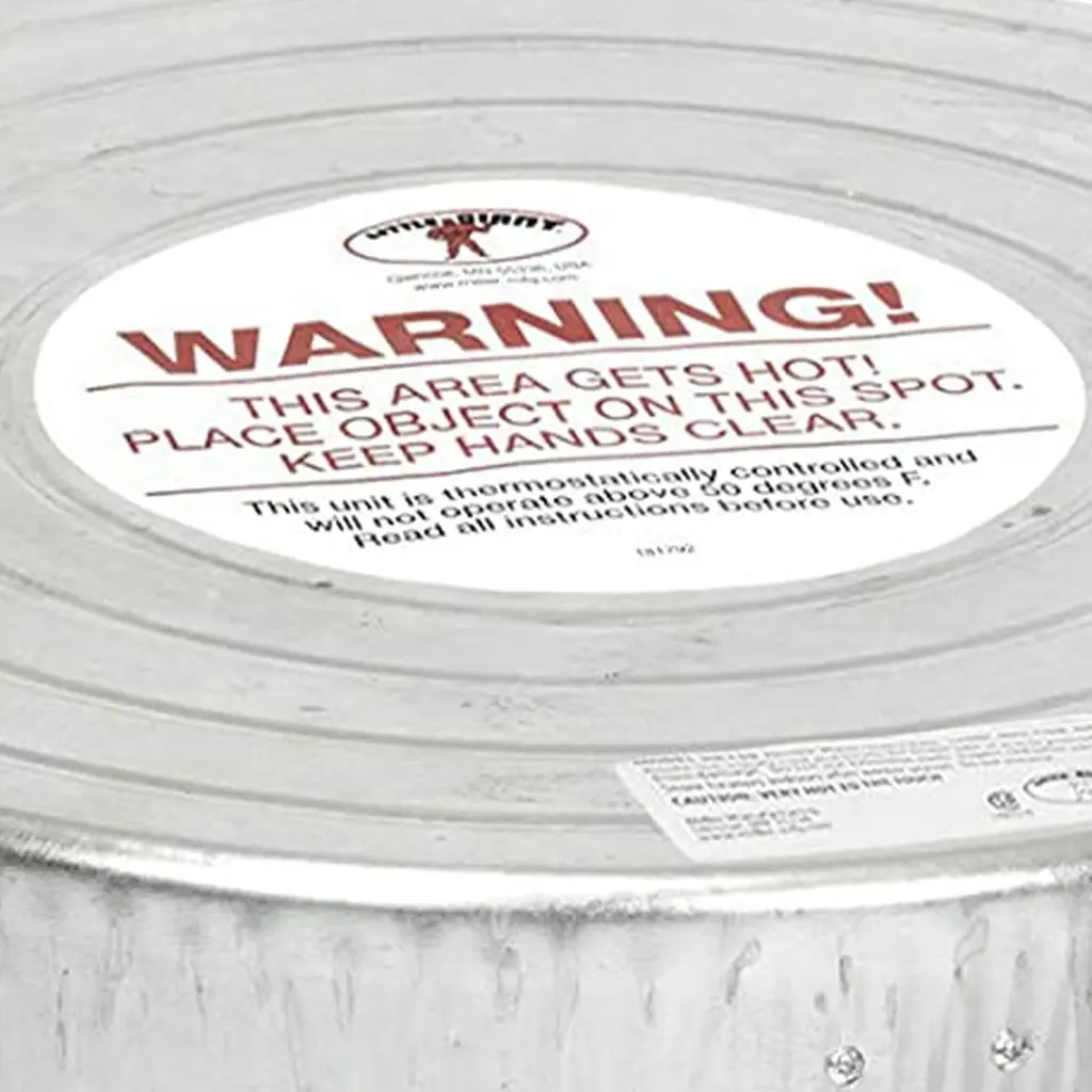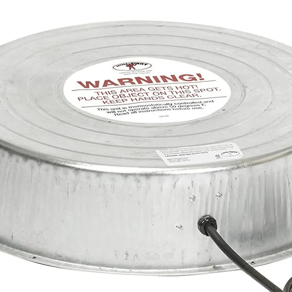 Heat water for your small livestock safely this winter with the 110-watt electric heater base by Little Giant. Prevent water from freezing in temperatures as low as 10-degrees Fahrenheit in your covered barn or chicken coop with this heater base. This heated chicken waterer base features galvanized steel construction and is durable, rust-resistant, and made to last. The heating element in this base has been completely redesigned for improved safety and efficiency. This model features a fully enclosed bottom to protect the heating element and provide improved fire safety. The cord of this device should be protected from animals and used with a Ground Fault Circuit Interrupter (GFCI) protected outlet. This heating unit is also energy efficient and turns on only when the temperature drops below freezing, using less than 1 amp per hour. Keep the water ice-free for your chickens and other livestock this winter with the Little Giant 110-watt Electric Heater Base. Electric heater base by Little Giant powers up to 110 Watts and uses less than 1 amp per hour Prevent water from freezing in temperatures as low as 10-degrees Fahrenheit Newly redesigned heating element and a fully enclosed bottom deliver improved fire safety protection and heating efficiency Constructed of durable, rust-resistant galvanized steel Heater will not draw electricity until the temperature drops below freezing Designed for use with chicken water fountains or other metal containers Color: Steel Dimensions (L x W x H): 17.6 x 16.8 x 3.69 inches Weight: 3.74 pounds Manufacturer warranty: 1-year warranty