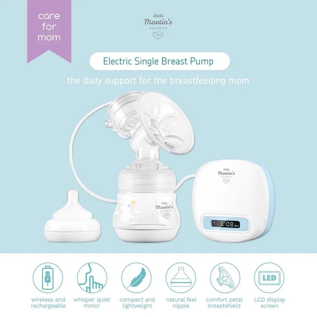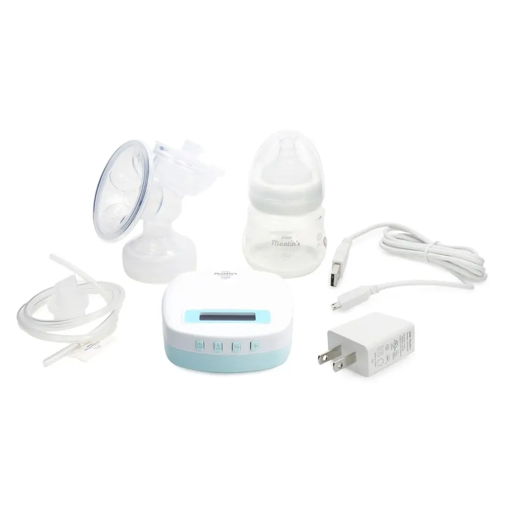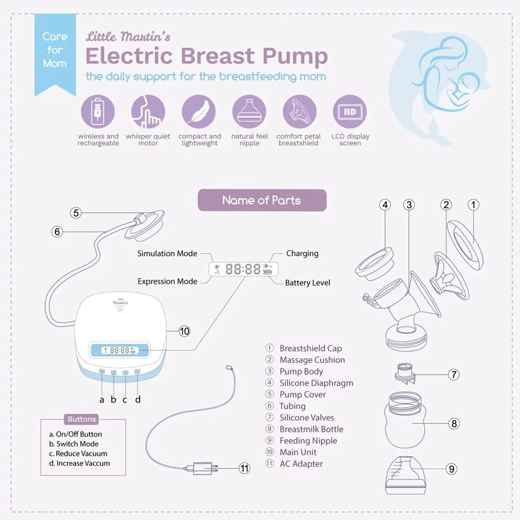 Little Martin's Electric Double Breast Milk Pump Kit, Rechargeable Battery - Wireless and Travel Friendly. Advanced rhythmic design mimics a baby's natural sucking behavior so you can safely release more milk, fast and consistently. Cushioned silicone breast shield maximizes comfort and prevents leakage. BPA free nipples are soft and natural.Features:Specifications: Technology: Simulation/Suction Tri-mode Technology Weight: 341g (incl. battery) Material: BPA free, PP, FDA approved Features: Display Suction Power: 60mmHg-280mmHg Noise Level: <60dB Product Life: >800 hours Lithium Battery Life: >500 charges Auto Shut Down Timer: 30 mins Warranty: 6 months