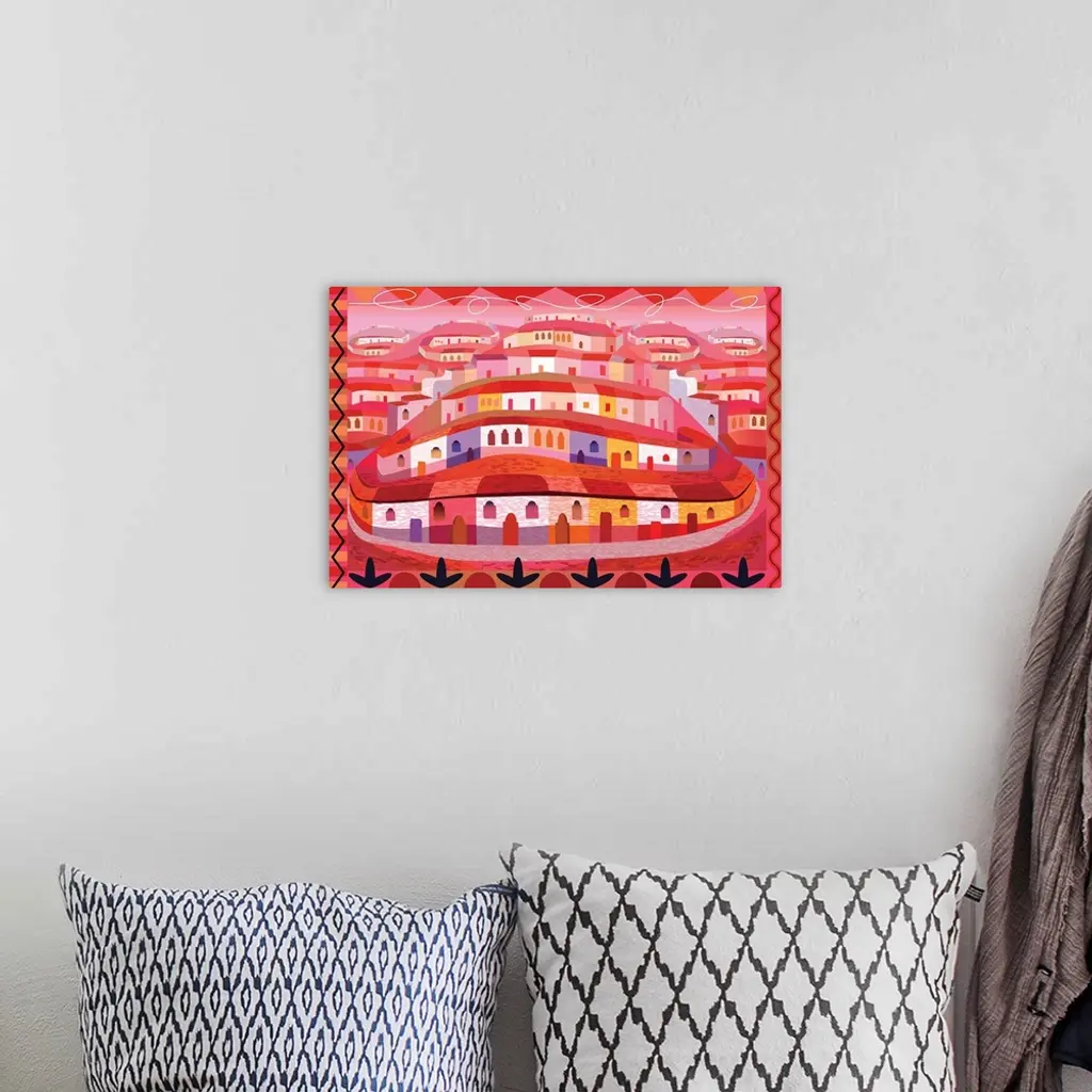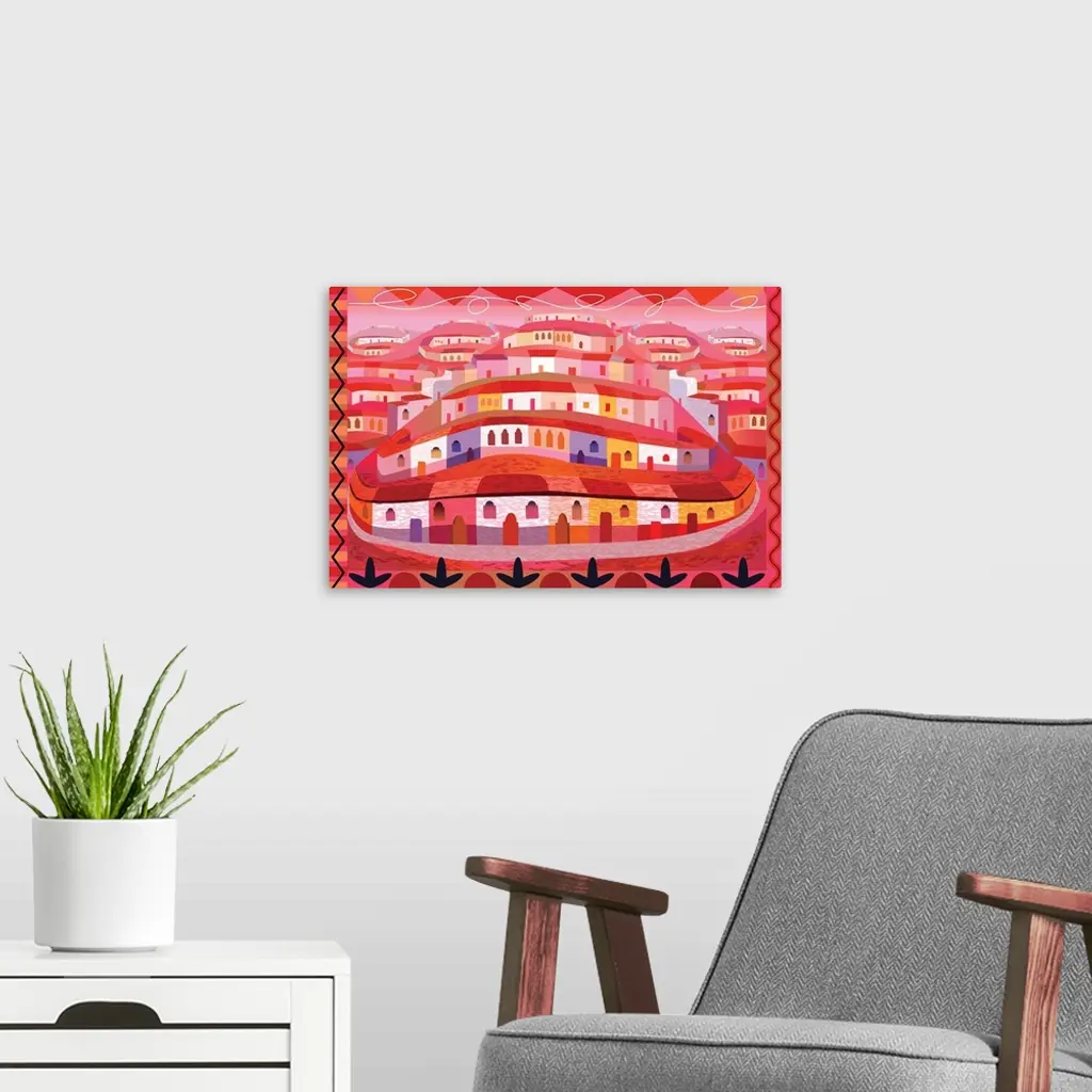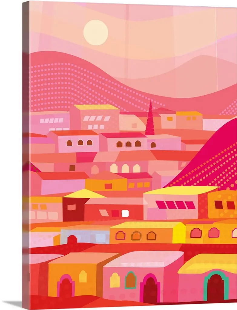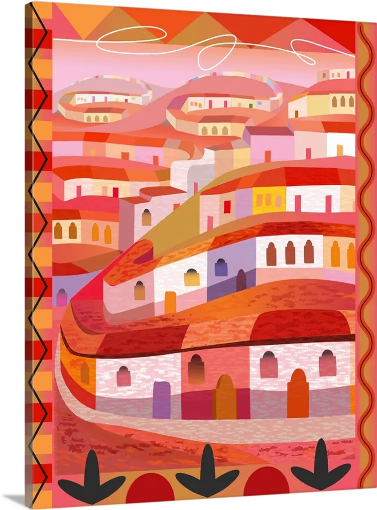 A digital illustration of a village with rows of houses along a hill side in warm shades of red.