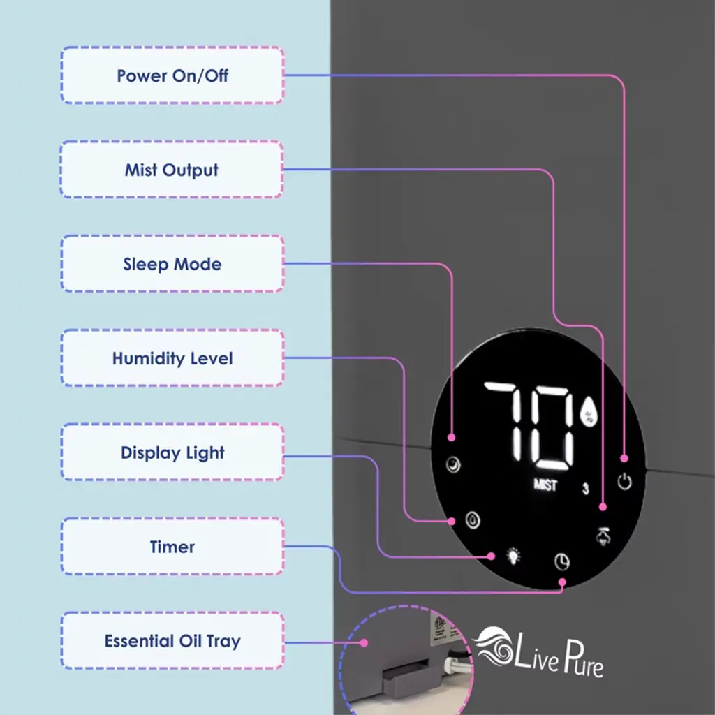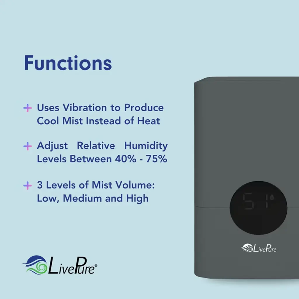 LivePure believes in delivering premium, performance-driven home environment products that elevate everyday life. The LivePure Ultrasonic Cool Mist Top Fill Digital Humidifier is a perfect example of that mission, combining modern design with natural comfort to improve your indoor air quality. Using ultrasonic vibration technology, this compact humidifier quietly releases a fine, cool mist to help relieve dry air. Ideal for variety of room sizes, from small rooms to large, including bedrooms, dorms, or desktops, and offers three mist output levels so you can personalize your comfort quickly and easily. The LivePure humidifier allows you to adjust the humidity control ranging from 40% to 75%, providing you with the freedom to choose how much humidity you want. The built in 1-12 hour timer allows to you set the how long you want the humidifier to operate before it turns off. This allows you to conserve both water and energy while ensuring the humidifier runs only when you want it. Refilling is simple with the removable water tank and built-in handle, designed for quick, spill-free top-offs. The tank also has a anti-bacterial nanosilver additive that helps prevent bacterial growth. Providing peace of mind that the mist will be clean. With a built-in aroma tray that can be easily removed from the bottom of the humidifier, this humidifier allows you to add essential oils to create a calming, spa-like atmosphere that enhances your space and your mood in your home or office. Whether you're winding down for the night or maintaining ideal moisture throughout the day, LivePure adapts to your needs with precision. Quiet, efficient, and easy to use, the LivePure Ultrasonic Cool Mist Top Fill Digital Humidifier is more than a wellness tool—it’s a reflection of our commitment to helping you live a pure, healthy, and inspired life.