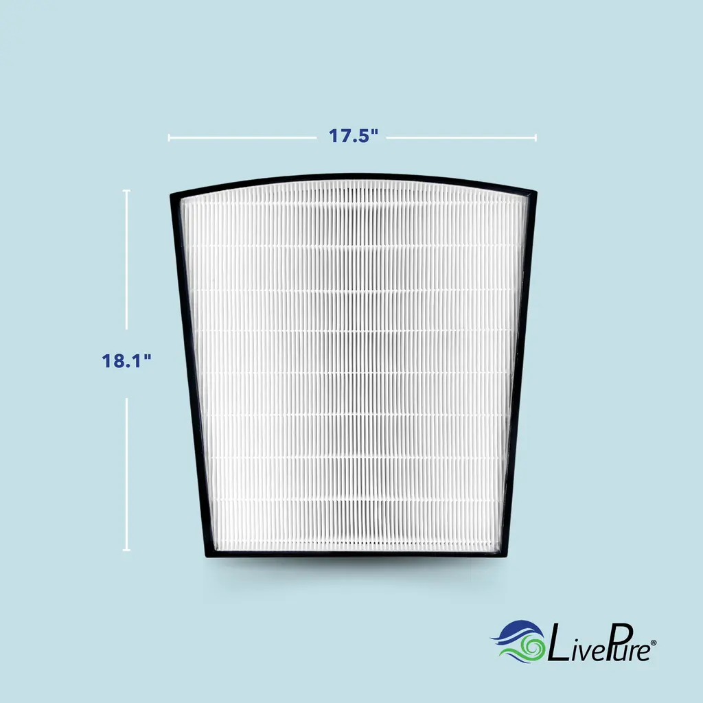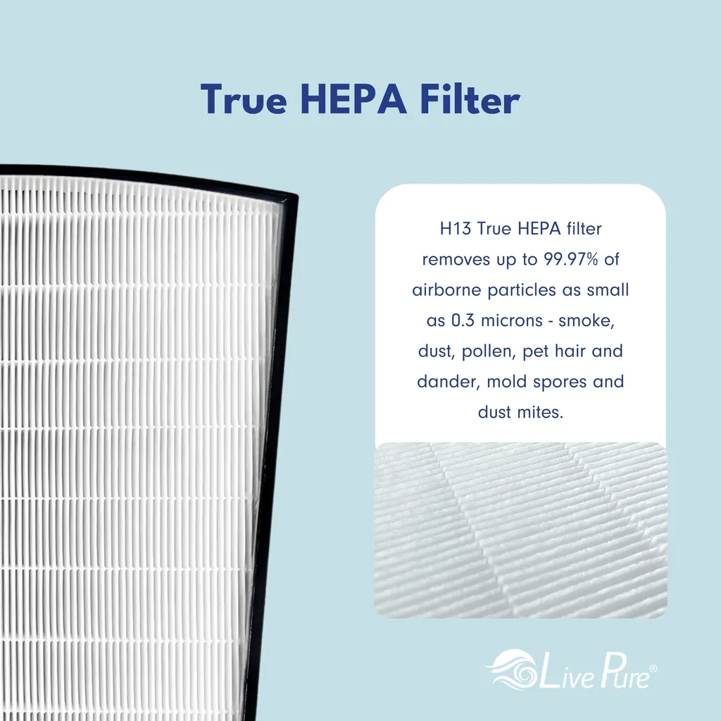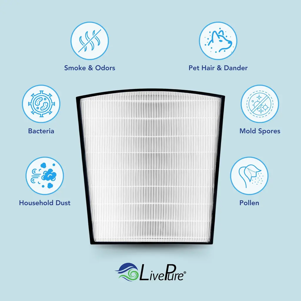True HEPA filter for LivePure Bali Series air purifiers. True HEPA filtration is medical grade filtration, and captures up to 99.97% of particles as small as 0.3 microns from the air. HEPA filters are effective at filtering particles including smoke, dust, pollen, pet hair and dander, and mold spores. Recommended to replace HEPA filter every six (6) months for maximum efficiency. What You Get:Additional Information:
