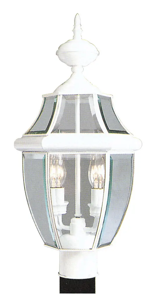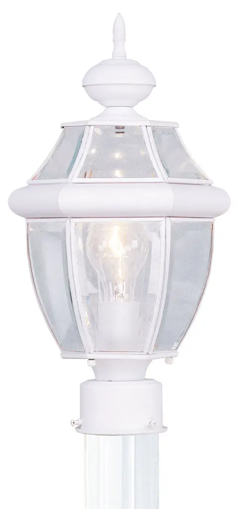 Collection: Frontenac, Material: Aluminum, Finish Color: Textured White, Width: 11.5", Height: 27.5", Lamping Type: Incandescent, Number Of Bulbs: 4, Wattage: 60 Watts, Moisture Rating: Wet Rated, Desc: This classically transitional, cast aluminum outdoor post lantern light is a six-sided lantern in white finish with clear beveled glass and a extravagantly decorative scrolls. Shade Included: Yes. ,