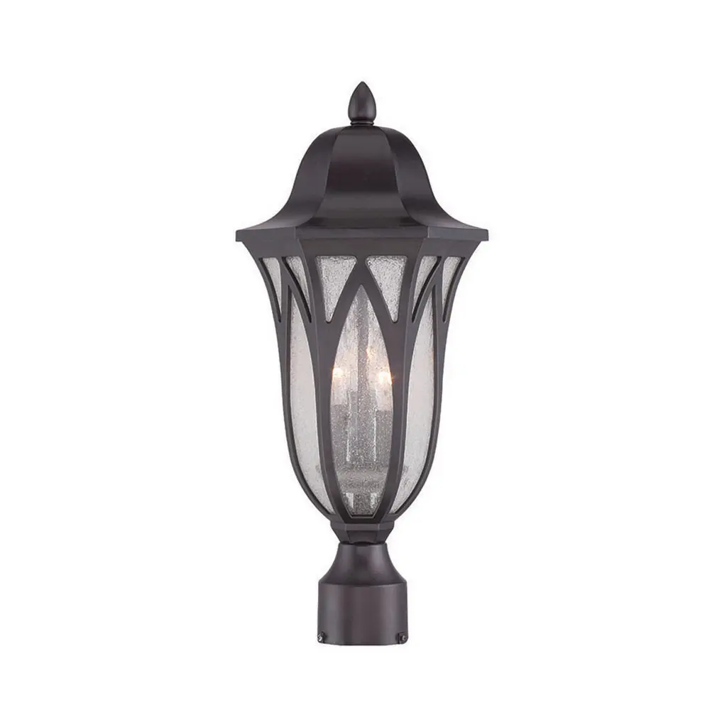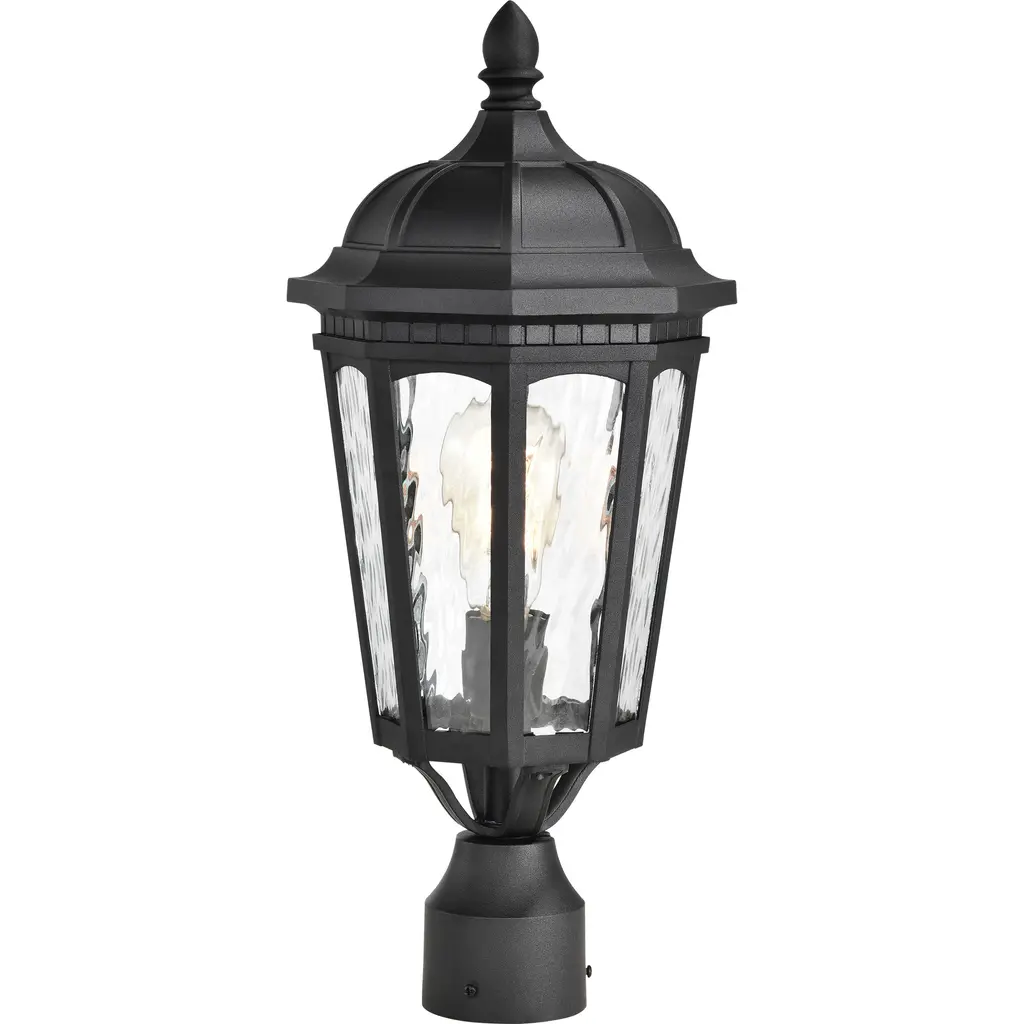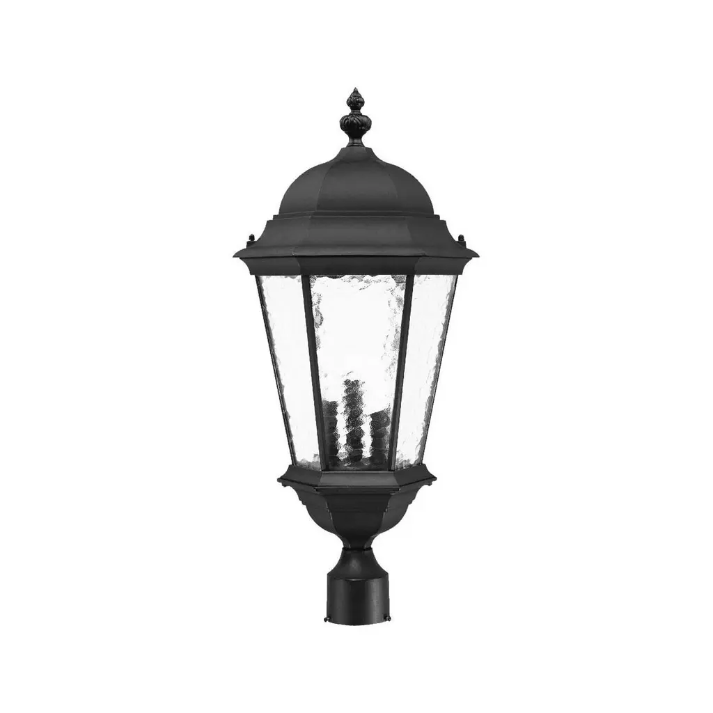 Collection: Hamilton, Material: Aluminum, Finish Color: Textured Black, Width: 12.5", Height: 27", Lamping Type: Incandescent, Number Of Bulbs: 3, Wattage: 60 Watts, Moisture Rating: Dry Rated, Desc: A decorative top and arm are paired with a simple six-sided frame in this textured black and clear water glass outdoor post lantern is constructed of cast aluminum. Shade Included: Yes. ,