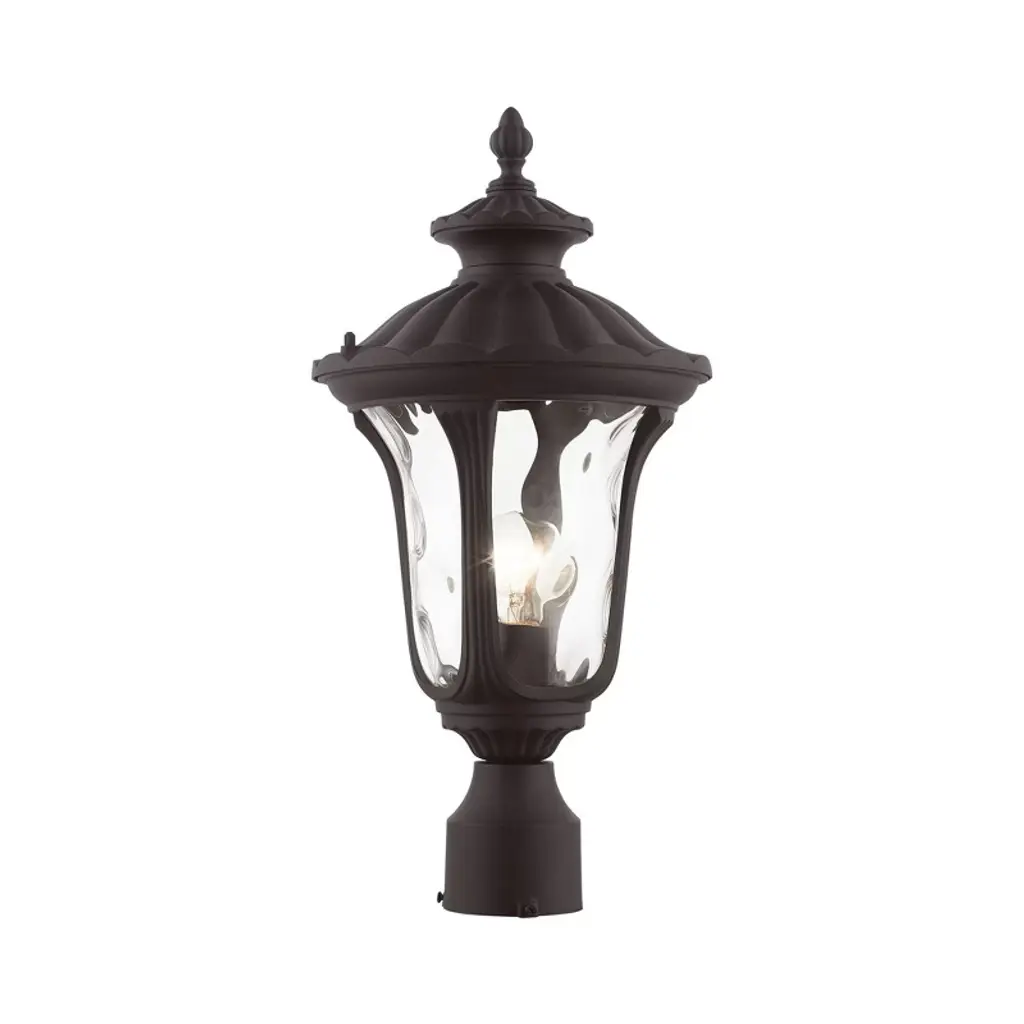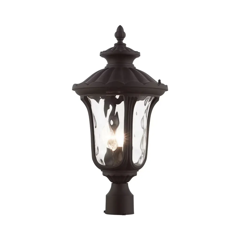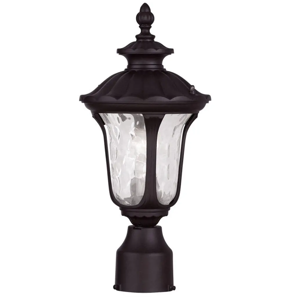 Collection: Hamilton, Material: Aluminum, Finish Color: Textured Black, Width: 12.5", Height: 27", Lamping Type: Incandescent, Number Of Bulbs: 3, Wattage: 60 Watts, Moisture Rating: Dry Rated, Desc: A decorative top and arm are paired with a simple six-sided frame in this textured black and clear water glass outdoor post lantern is constructed of cast aluminum. Shade Included: Yes. ,