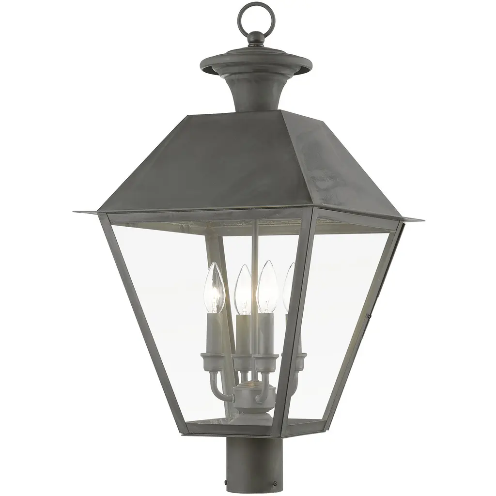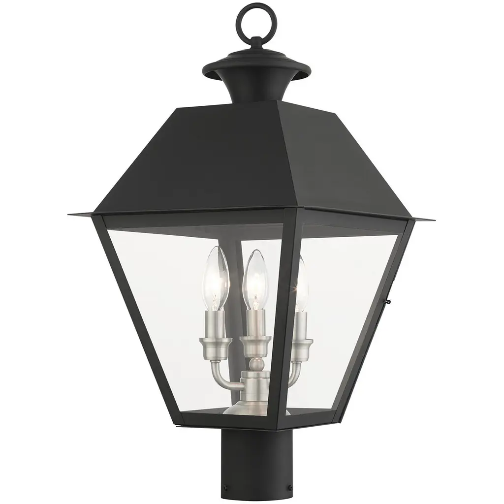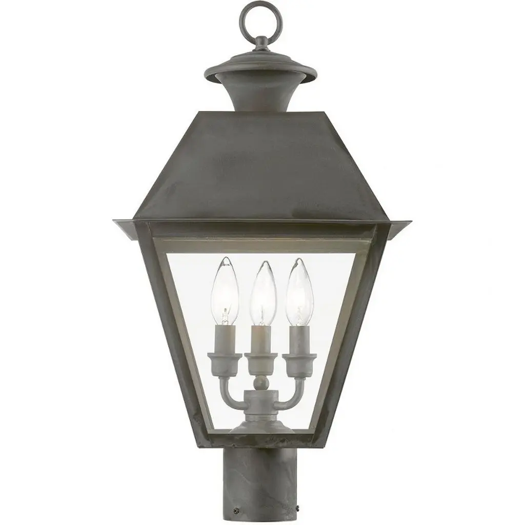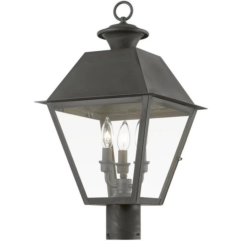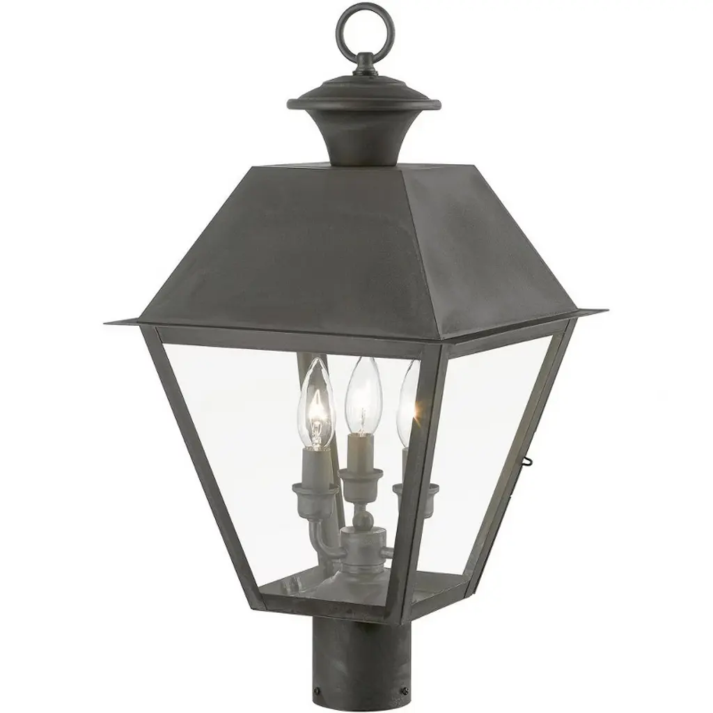 Collection: Wentworth, Material: Brass, Finish Color: Charcoal, Width: 12", Height: 22", Lamping Type: Incandescent, Number Of Bulbs: 3, Wattage: 60 Watts, Moisture Rating: Dry Rated, Desc: With its appealing bronze finish and clear glass, the stunning Mansfield collection will make an elegant addition to any outdoor space. Formed from solid brass & traditionally inspired, this three-light outdoor large post top lantern is complimentary to almost any home exterior. Combining superb craftsmanship and affordable price, this fixture is sure to be a timeless addition to your home.,