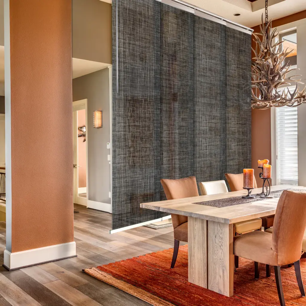 Central Design Products is pleased to introduce a new innovative panel track that offers easy 2-way installation, adding an alluring style and refined touch to your home decor. The single rail design of the track is sleek, compact, and reduces the overall footprint and weight of the installation, eliminating bulky, intrusive window treatments. Adjusting the panel height is a breeze � simply trim the panel, re-attach the liner, and install the panel weight. Detailed instructions are included.The panel track also features a patented slider design, made with aluminum and fitted with bearings that allow for durable and smooth operation. The sliders are stacked closer together than conventional panel tracks, reducing light bleed coming from the gaps between panels. This track has endless uses from dividing rooms, garages, offices, and closets to decorating windows and patios. Available in larger sizes including 8, 10, and 12 panels. Extends from 48-88� wide. Each panel measures 23.5" wide and 116" tall, with a total installation height of 118.5" (includes the 2.5" rail track). The track can be wall or ceiling mounted. The panels can stack on the left or the right. The clearance from the wall is extendable from 1.25� to 3.25� and projection from the wall is extendable from 3� to 4.25�. Lizbeth panel is made from 85% Vinyl 15% Polyester, with a light filtering shade that blocks 40% of the light.