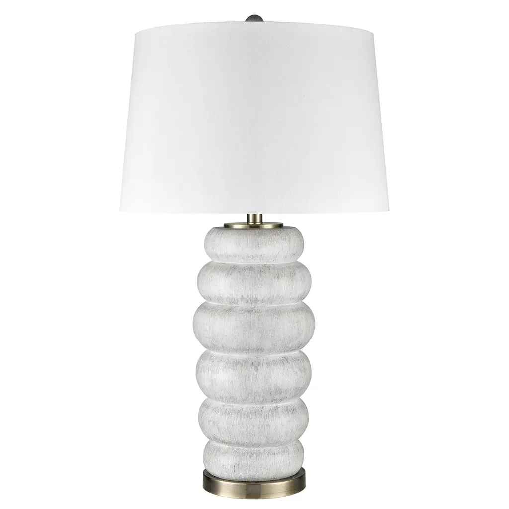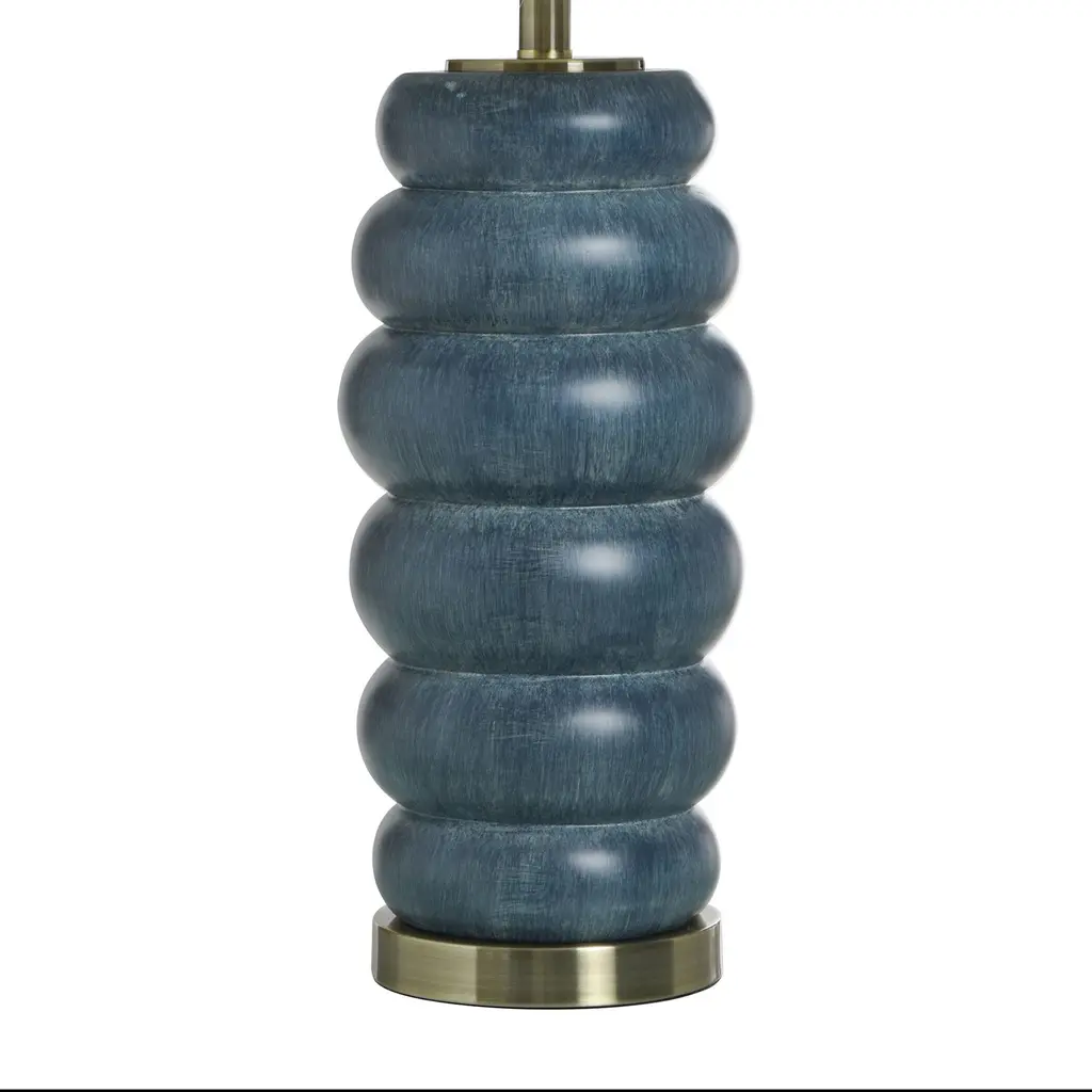 This layered table lamp has a unique design that is meant to draw attention. The lamp base is finished in a blue denim wash and features brushed brass accents.Due to the production process, each piece is unique and no two are exactly alike.Add a pop of design in your space with this unique denim washed table lamp.Made from polyresin and featuring brushed brass accents, this is the perfect piece to decorate in your home.Weight: 9.5 poundsSocket Type: E26Socket Quantity: 1