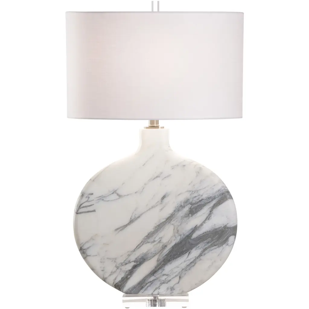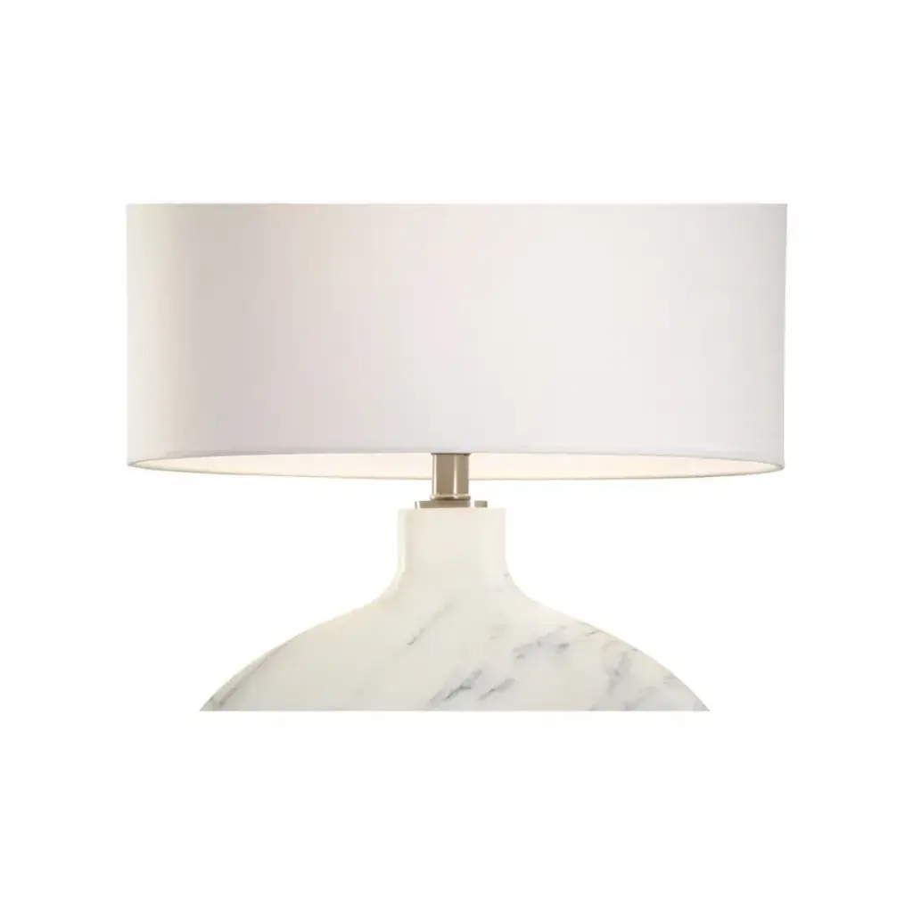 The Lizzie Lamp showcases a mesmerizing marble pattern, meticulously crafted to mimic the natural beauty and texture of marble stone. Each swirl and vein is intricately detailed, creating a stunning visual effect that adds sophistication and charm to any room. The lamp features a ceramic body adorned with a captivating black and white marble pattern, resting atop a sleek acrylic base and finished with a coordinating finial. Designed by Shayla Copas.
