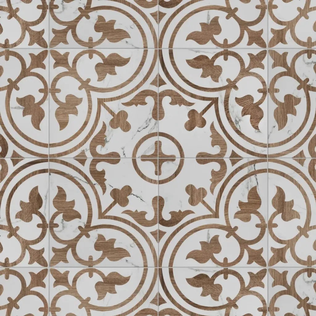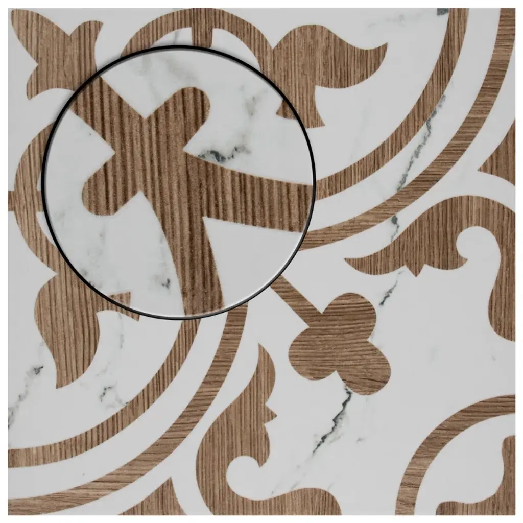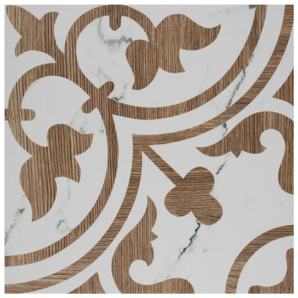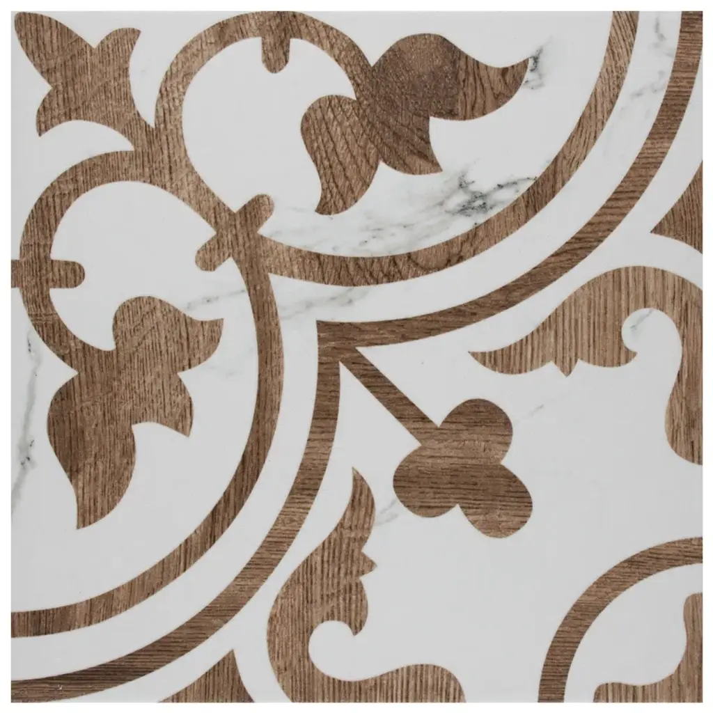 Blending two distinct textures. This porcelain tile features a large floral old-world design in a soft wood-look pattern, offering stunningly realistic woodgrains and variable fades to the decoration. The contrasting design is complemented with stormy veining which varies for added authenticity. This porcelain floor and wall tile feature a gentle relief texture, lending added warmth and natural realism to surfaces. Available in 24 different print variations that are randomly scattered throughout each case, this tile offers a one-of-a-kind look. Its impervious, durable, and frost-resistant features make this an ideal choice for indoor and outdoor installation locations including backsplashes, bathroom floors and walls, showers, kitchen floors, and walls, fireplaces, and patios.