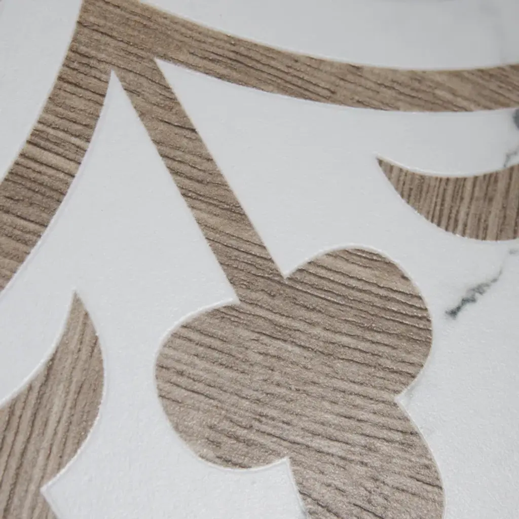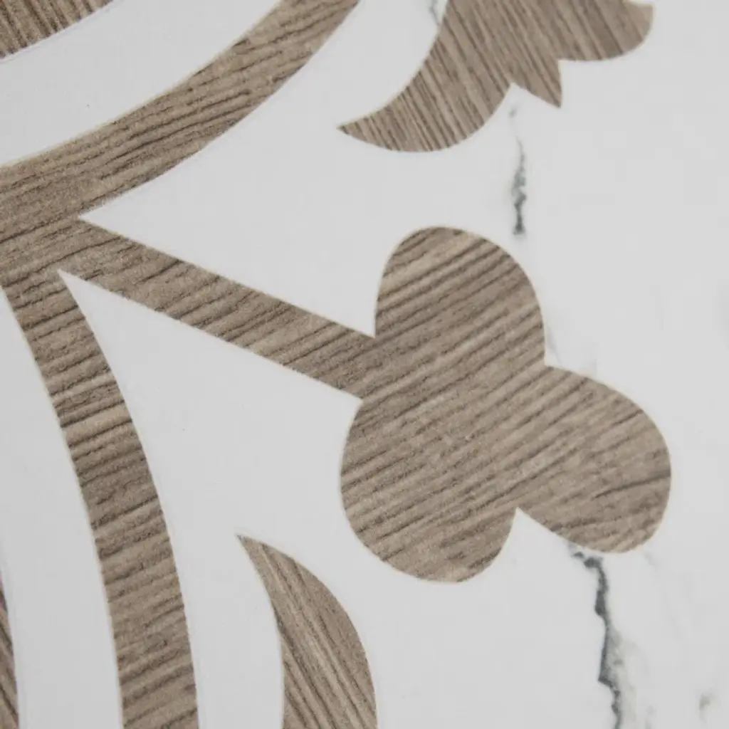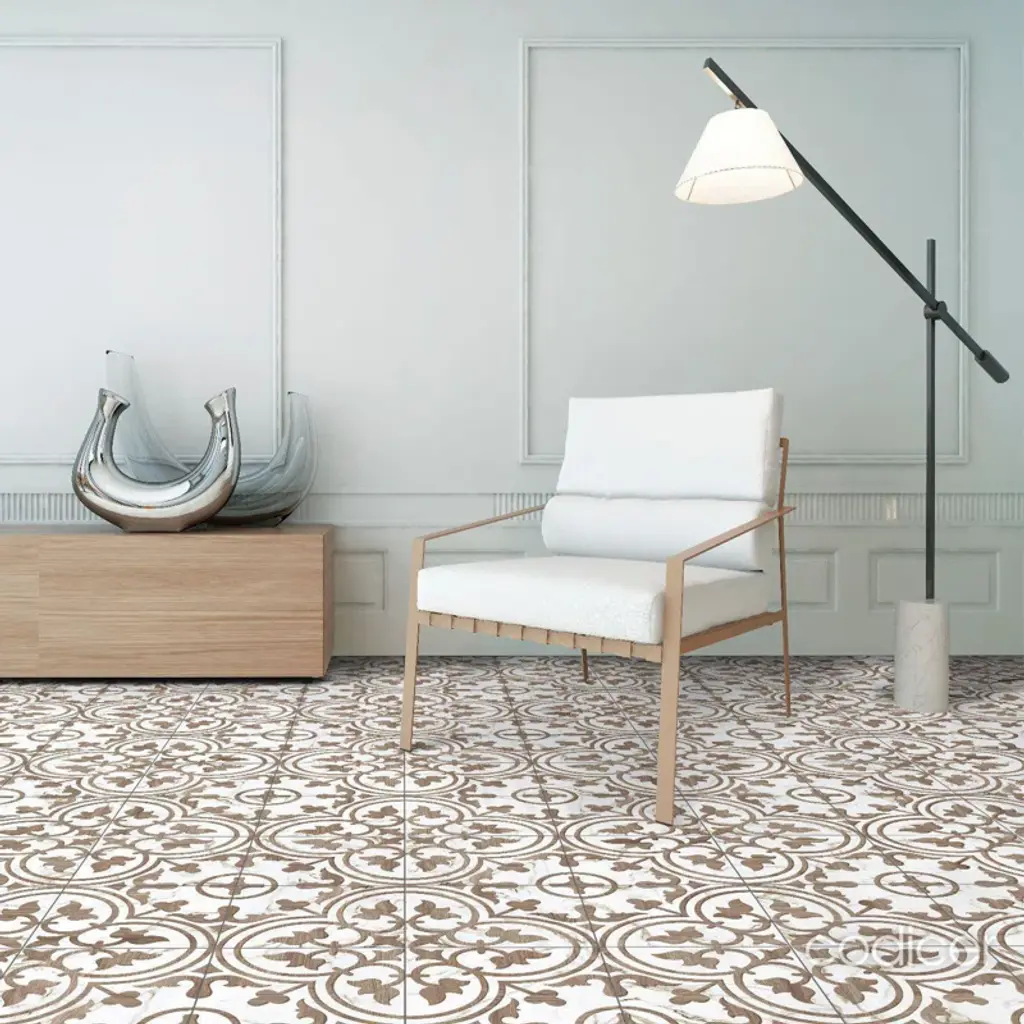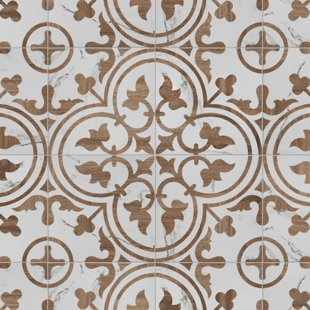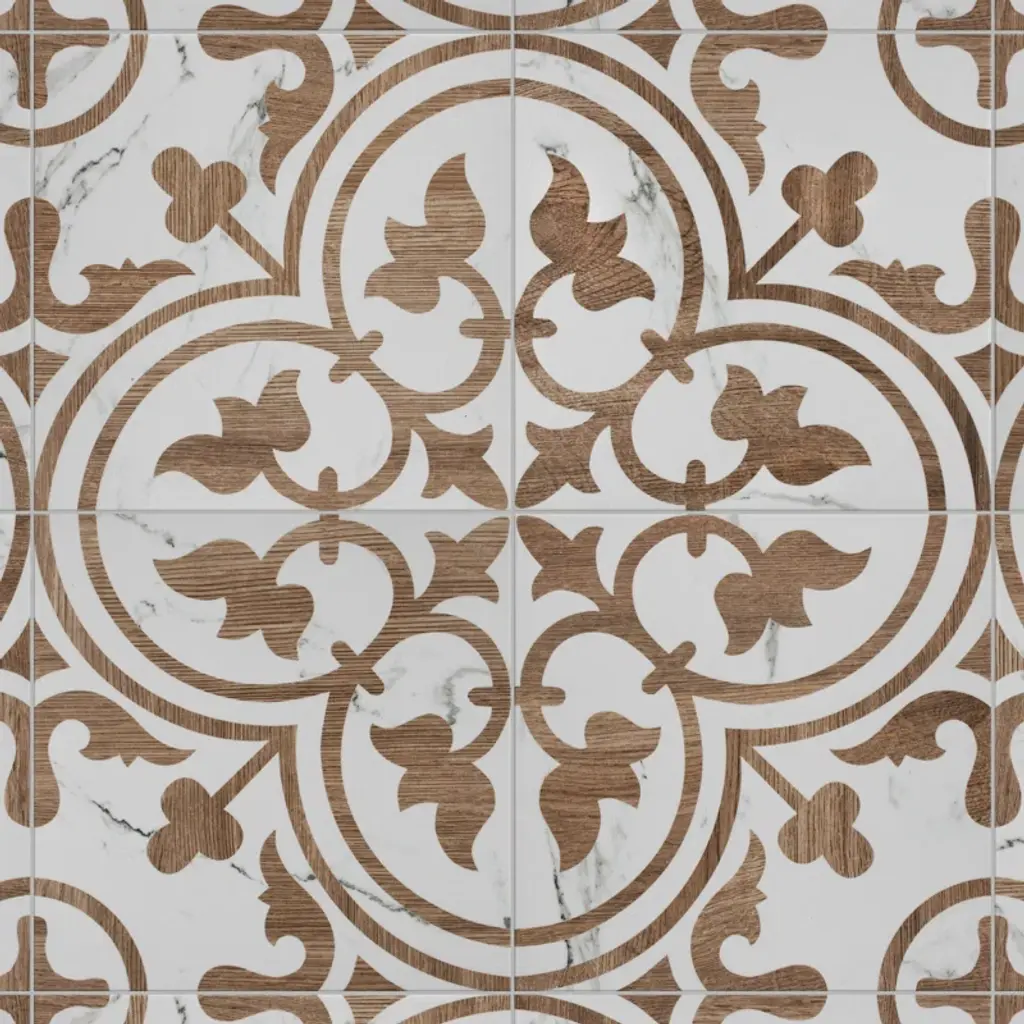 Blending two distinct textures. This porcelain tile features a large floral old-world design in a soft wood-look pattern, offering stunningly realistic woodgrains and variable fades to the decoration. The contrasting design is complemented with stormy veining which varies for added authenticity. This porcelain floor and wall tile feature a gentle relief texture, lending added warmth and natural realism to surfaces. Available in 24 different print variations that are randomly scattered throughout each case, this tile offers a one-of-a-kind look. Its impervious, durable, and frost-resistant features make this an ideal choice for indoor and outdoor installation locations including backsplashes, bathroom floors and walls, showers, kitchen floors, and walls, fireplaces, and patios.