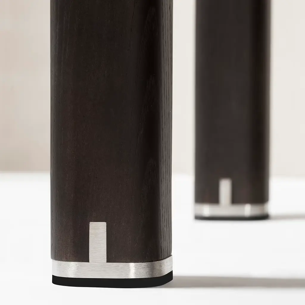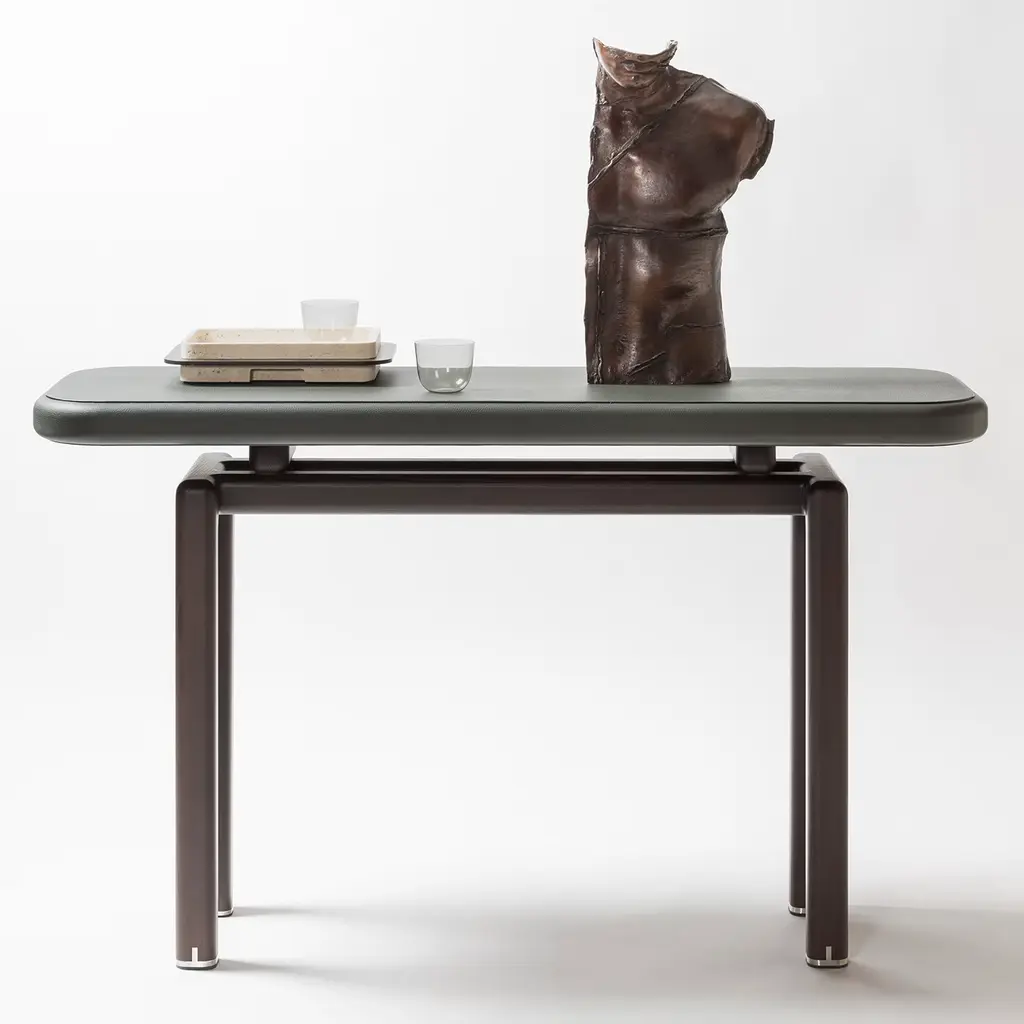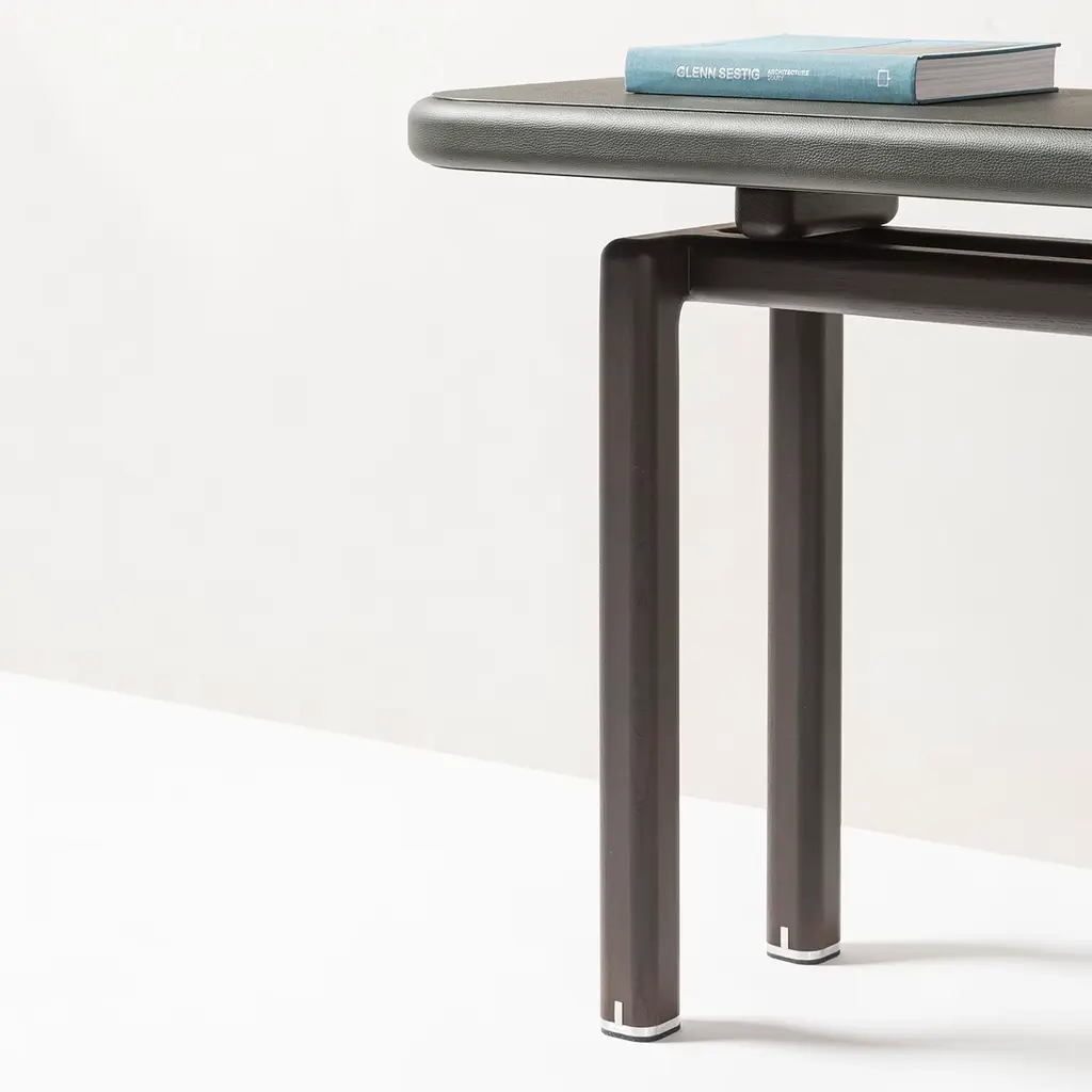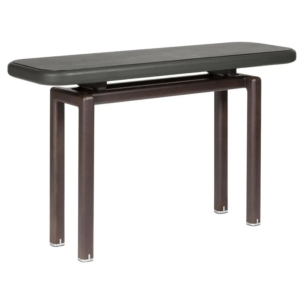 Made of leather and dark-stained Canaletto walnut wood. It's provided with inox decorative feet. Custom sizes available on request.