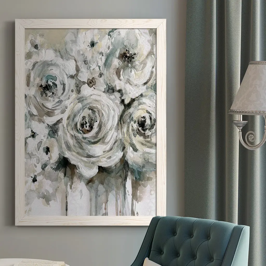 Hanging Rose Garden by artist LM Zhou is a dimensional piece showcasing a gorgeous display of roses and hand-painted leaves on canvas. The pristine white tones paired with splashes of gray lend a tasteful sophistication to a space. The piece is held within a silver aluminum gallery frame and may only be displayed from a vertical orientation.