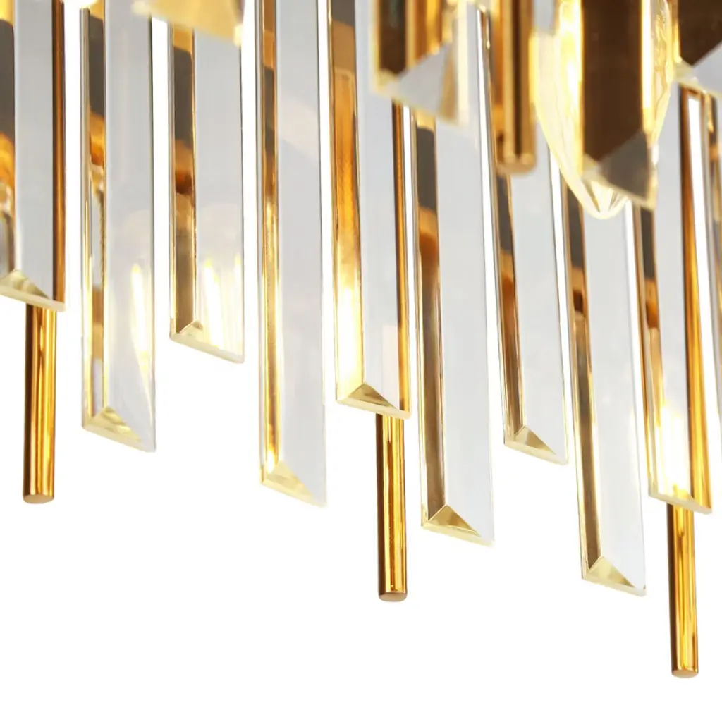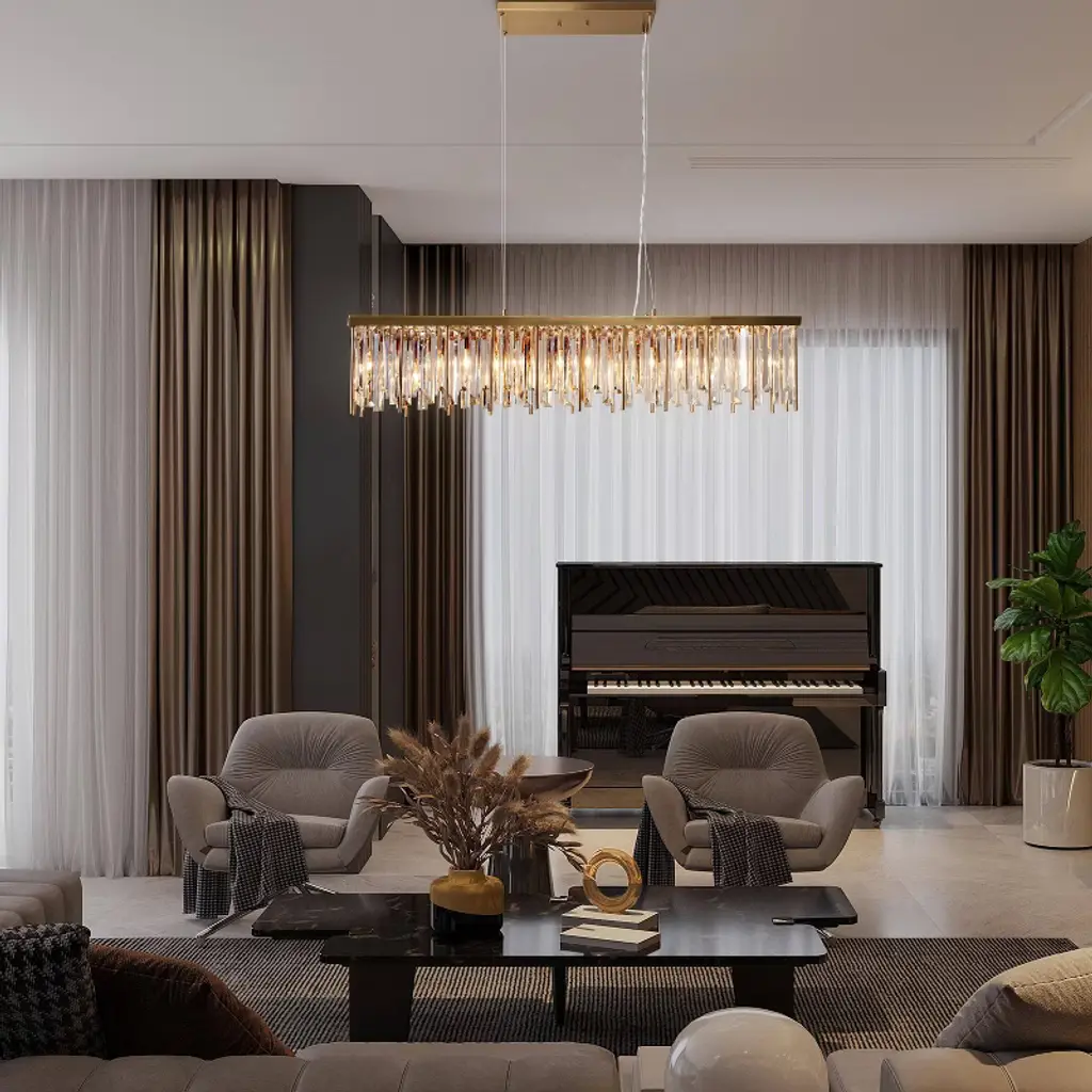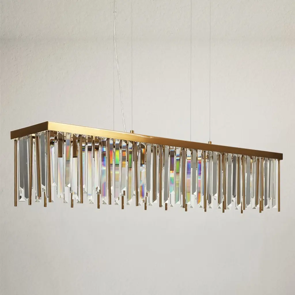 Elevate your space with the bold elegance of this 7-Light Plating Brass Crystal Linear Chandelier. A stunning blend of crystal and metal rods hangs in a dynamic, asymmetrical arrangement, casting a mesmerizing play of light. Like a frozen moment of cascading rain, this piece brings a unique energy to any room. The sleek, modern design reflects sophistication while offering a touch of drama that’s perfect for transforming your space into something extraordinary.