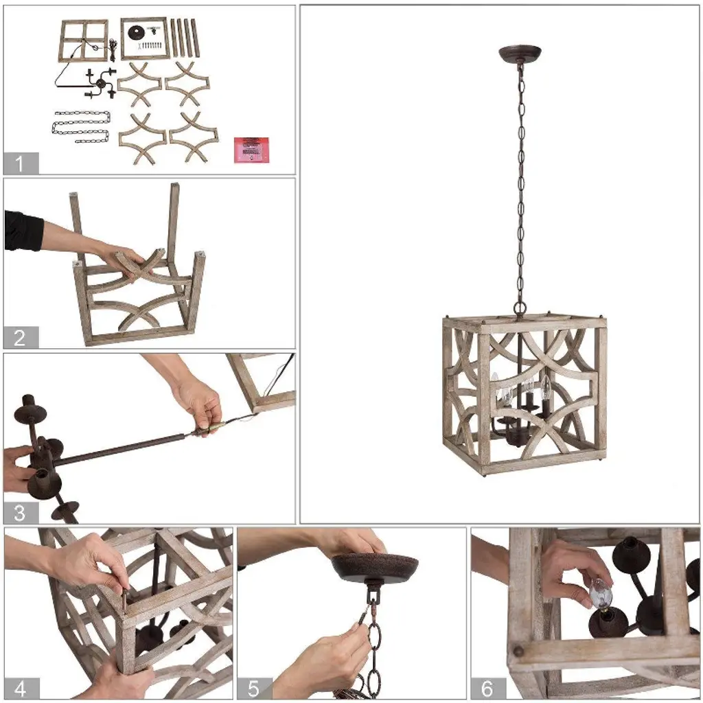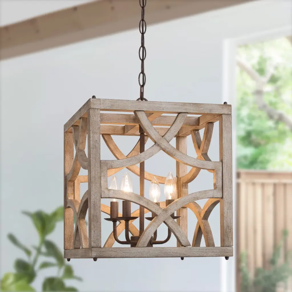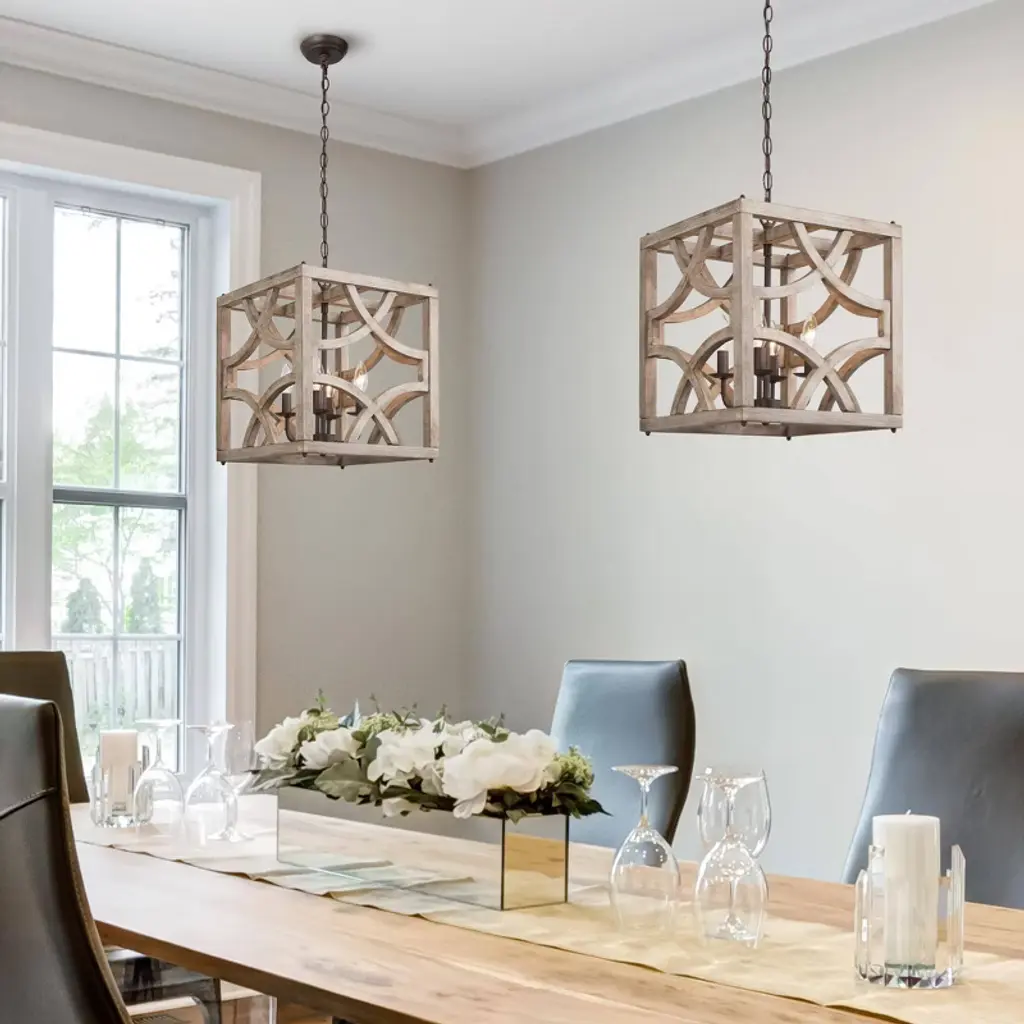 This attractive farmhouse kitchen island light is made of superior solid birch wood, handcrafted curved hollow cage adds a breezy touch to any space in your home, presenting a simple and elegant silhouette. The hand-painted antique white wood color with rusty bronze finish over the metal part adds a romantic farmhouse chic to your living space.