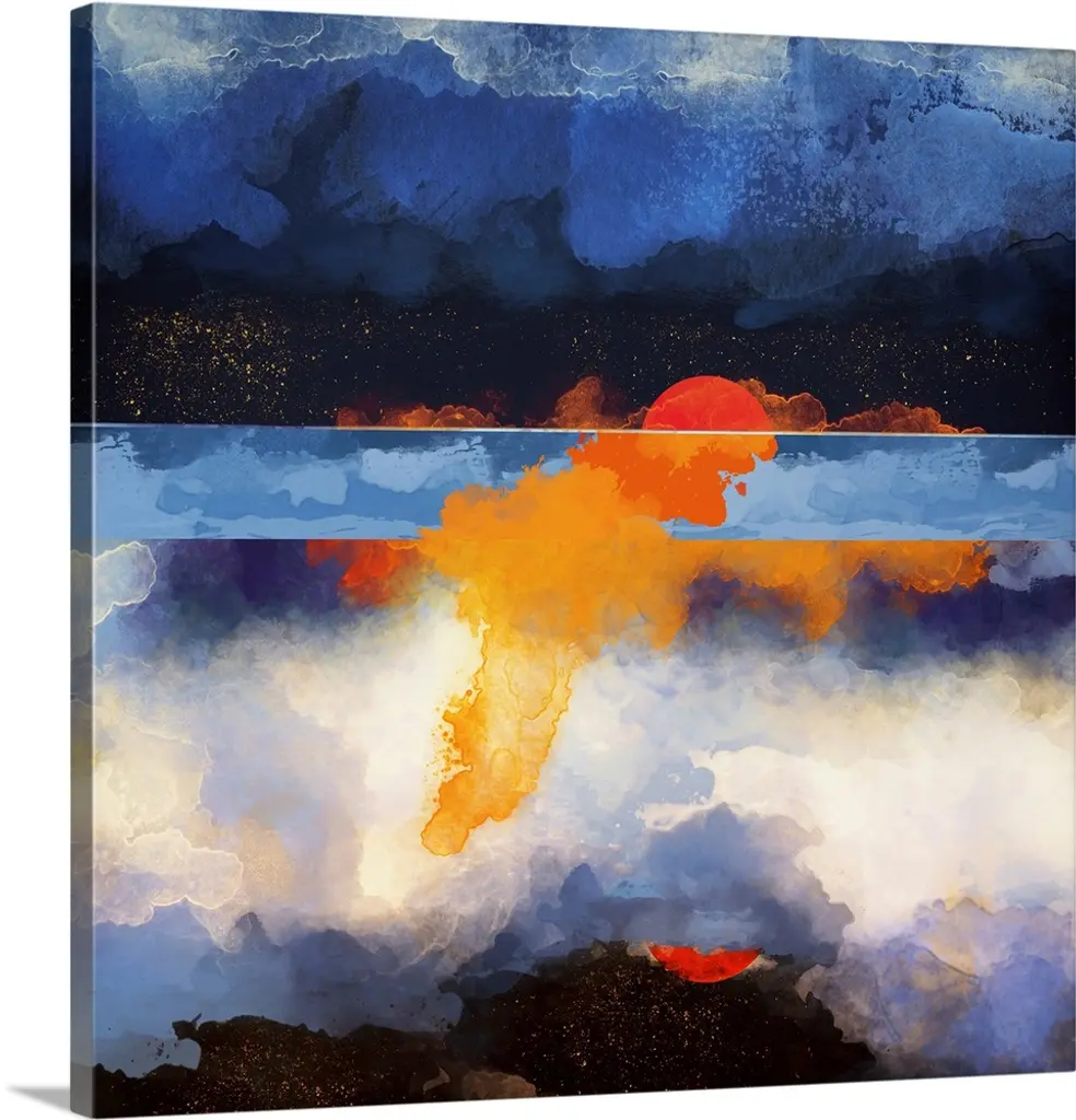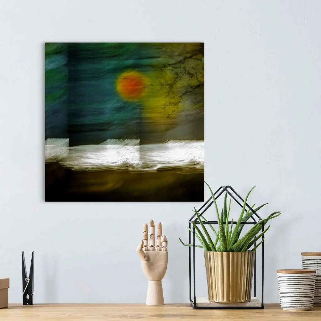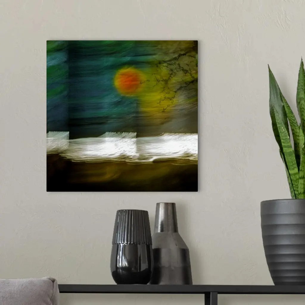 Surreal landscape photograph of a Lochside with moving lines and a bright sun.