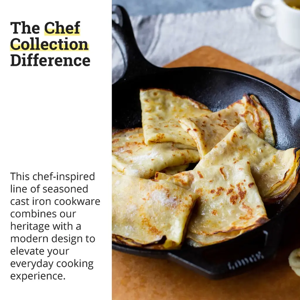 Welcome to Lodge, where cookware is the heart of memorable meals. Our Chef Collection 10 Inch Cast Iron Skillet is a testament to culinary tradition, featuring ergonomic handles and spatula-friendly sidewalls. The skillet is seasoned with 100% natural vegetable oil for a reliable nonstick finish and is made from non-toxic, PFOA and PTFE-free materials. Suitable for oven, stove, grill, or fire, it offers superior heat retention for even cooking. With factory seasoning, larger pour spouts, and a curved handle, it's lighter and easier to handle. Made in the USA, Lodge cookware is crafted to last generations. With over 125 years of experience, Lodge is a family-owned company committed to quality and sustainability.