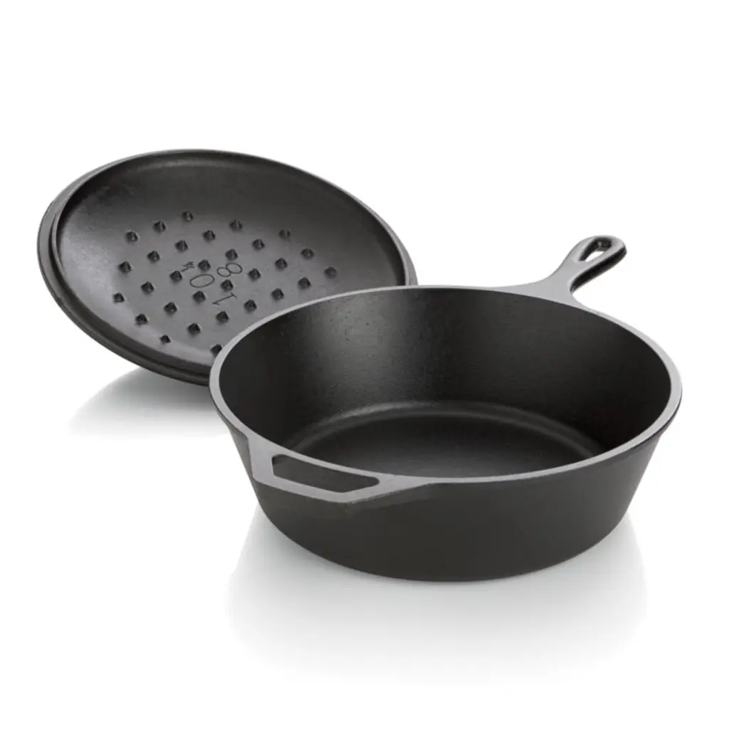 Grandma was on to something with the timeless cast iron skillet, preferred by many chefs. With all the benefits of cooking with cast iron without the hassle of seasoning, this ready-to-use pre-seasoned pan gives that homespun cast iron appeal and solid performance. The process of seasoning is done with a proprietary, high-density vegetable oil formula that is sprayed on electrostatically and then heated in industrial-grade gas ovens to ensure deep penetration into the cast iron surface. Renowned for its superior heat retention, cast iron also keeps its cool to serve chilled salads, desserts and cold dishesand this deep, lidded skillet is ideal for taking foods to picnics and potlucks. Can be used on induction ranges and ceramic cooktops. Because of its extremely high heat retention, cast iron is a versatile material that can be used on almost any heat sourceeven over a grill or campfire. From pan-fried fish to cornbread, and pizza to bacon and eggs, cast iron skillets, griddles, pans and woks cook up an outdoor feast. This heavy-duty cookware serves up sides, too.Each piece of Lodge cast iron cookware is backed by the company's 120 years of experience.