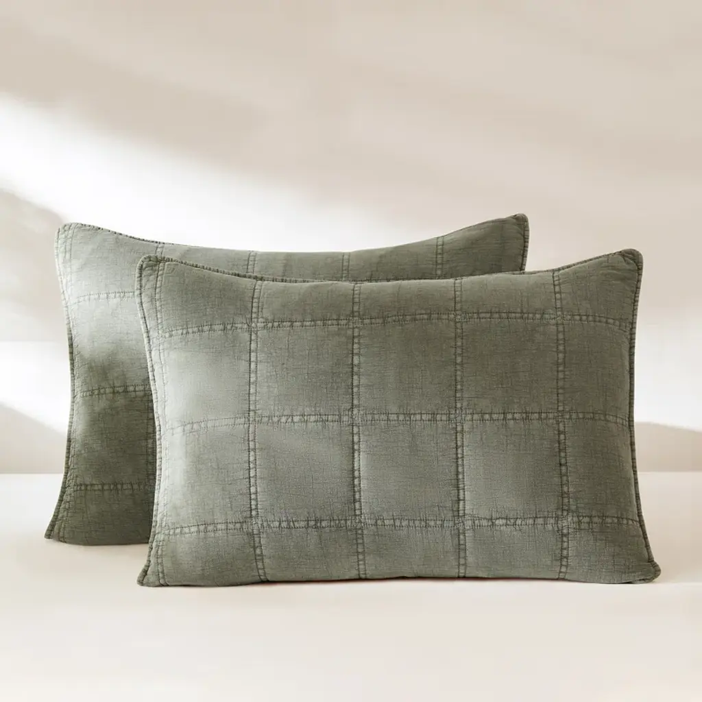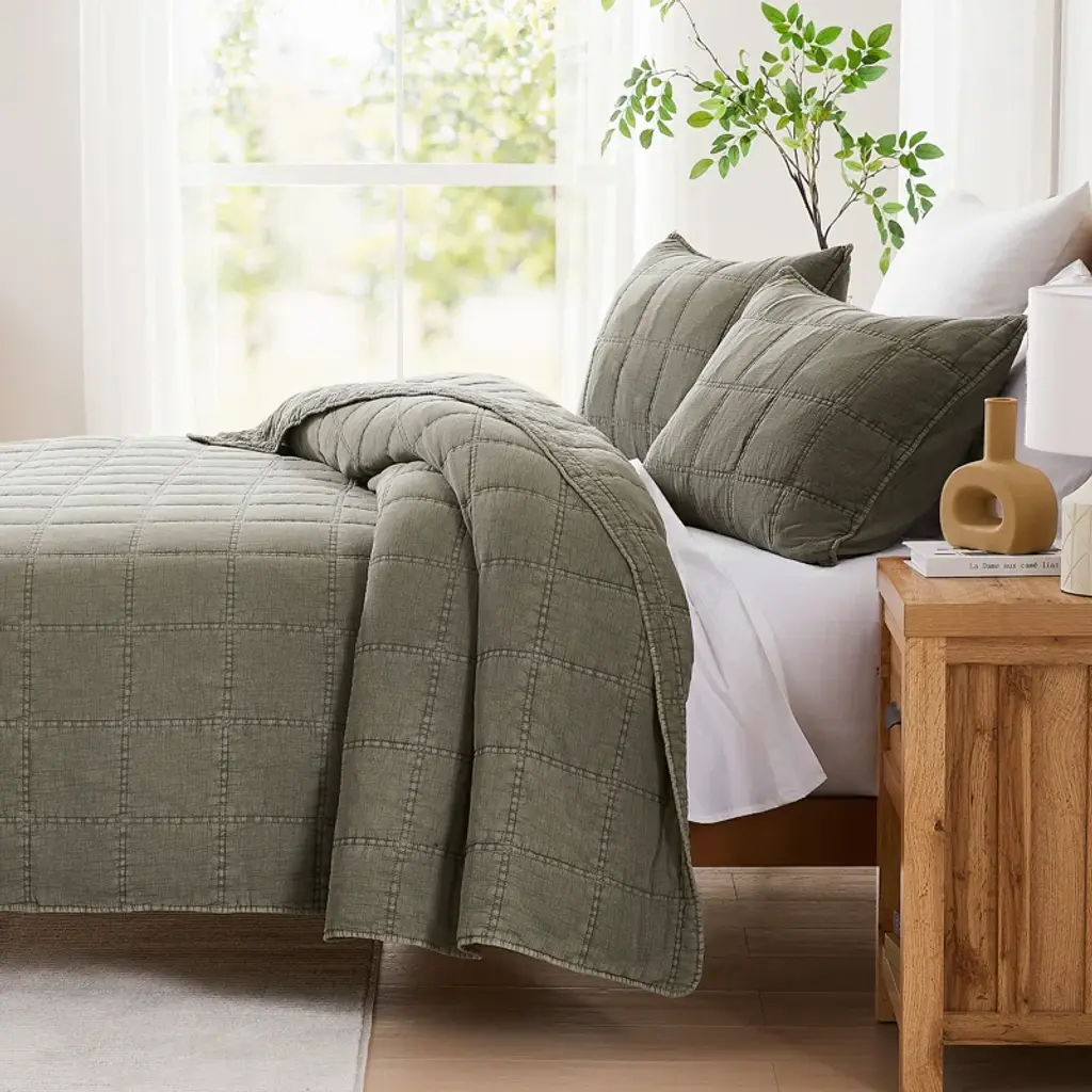 The cozy look on this Logan Stone Washed Cotton Quilt Set is brought by a fabric treatment that gives a faded design, similar to denim, yet remains so very soft. If you're looking for a soothing vibe, this is the set for you. This earth toned bedding adds warmth to your minimalist, boho, rustic, or Scandinavian styled primary or guest bedroom. The box quilting gives this cotton quilt set a comforting and homey pattern that adds to its lived-in stone wash look. The reverse of this quilt matches the solid colored front. This bedding is great for all ages and the faded fabric look makes it the perfect addition to a vintage styled bedroom. This cotton bedding set offers both softness and breathability. The lightweight polyfill is perfect for hot sleepers and great as an extra layer for those cold sleepers who layer-up to keep warm. This 3 piece bedding set includes 1 soft quilt and 2 matching pillow shams. This bedding set is easy to maintain. Simply machine wash separately in cold water on the gentle cycle. Tumble dry low. Use only non-chlorine bleach for cleaning or iron on low heat to remove wrinkles if needed.