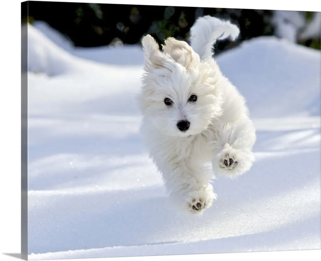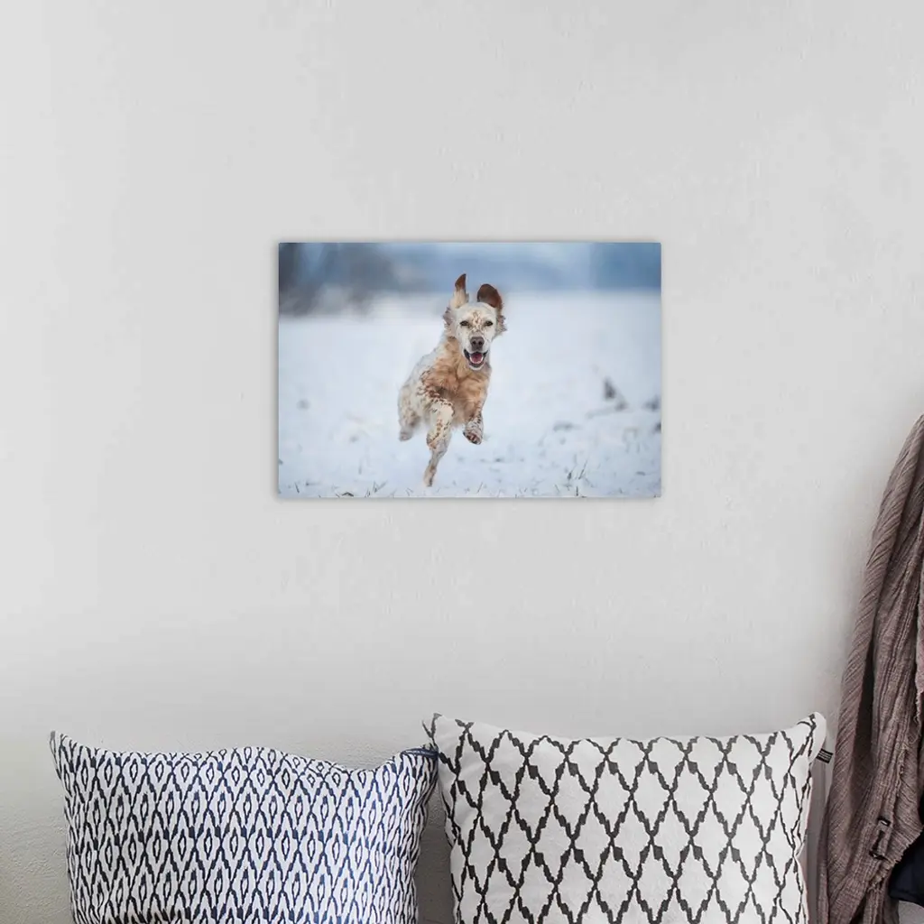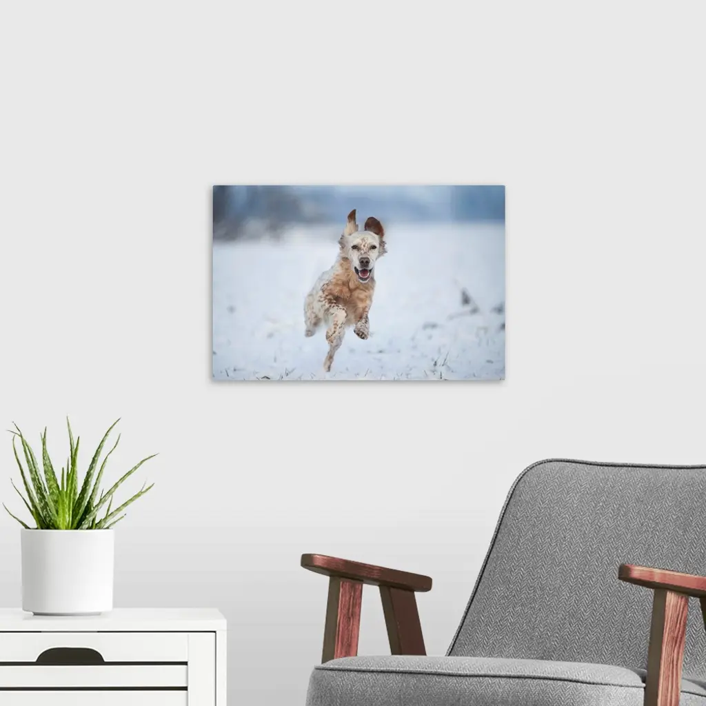 Lombardy, Italy, Europe, An English Setter Dog Is Running On A Snow Covered Field
