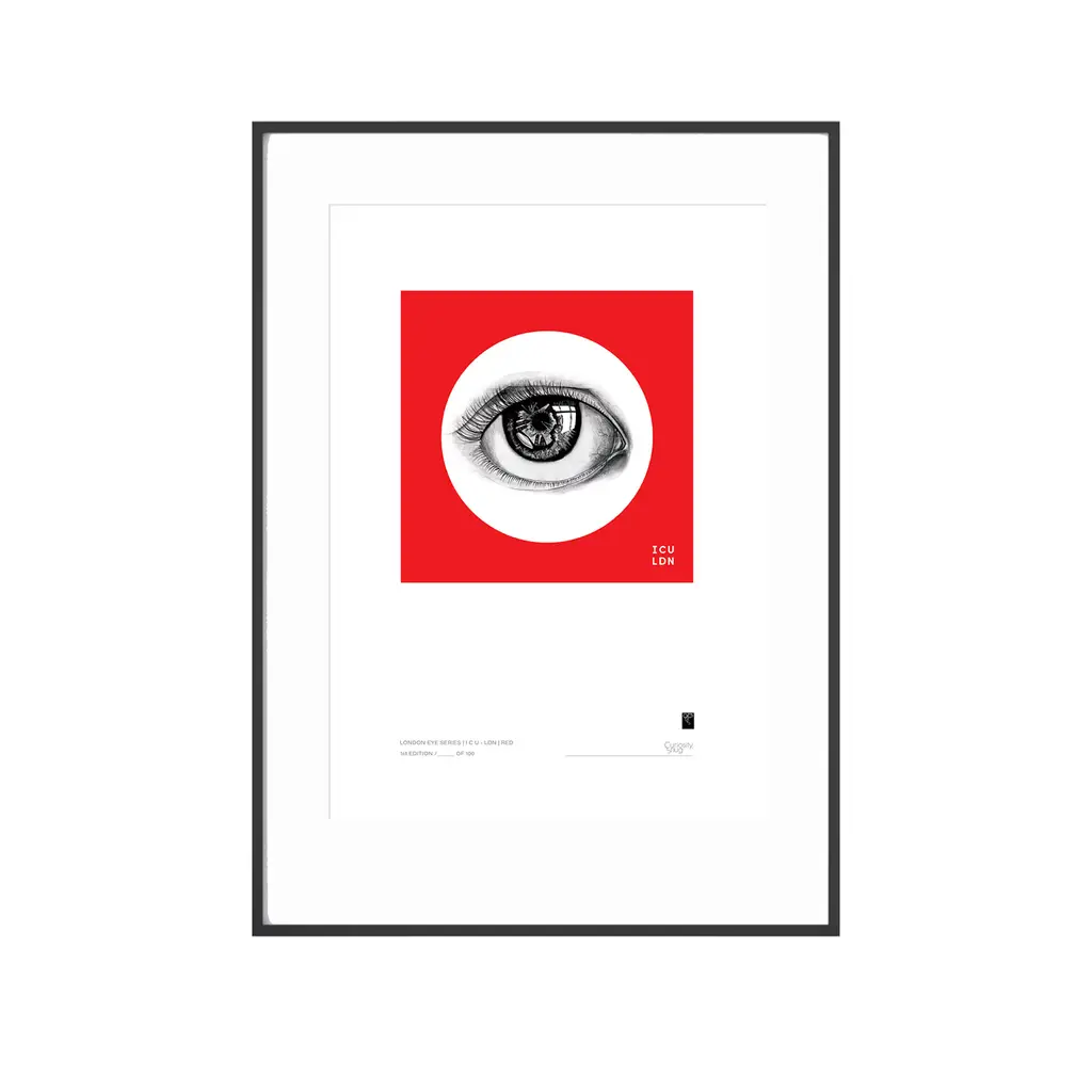 'London Eye Series - I C U - L D N - Multicolour' - Limited Edition Print offers a fresh perspective on the city's beauty, inviting viewers to explore London in a new light. Whether you're a native Londoner or a curious traveler, this piece is a visual journey through the heart of one of the world's most beloved cities.Each intricately detailed landmark, from the majestic Tower Bridge to the historic Big Ben and of course the London Eye, is delicately woven into the fabric of the eye, creating a fascinating tapestry of urban wonder. As you gaze upon the ink strokes, let your imagination soar as you uncover hidden gems and familiar sights nestled within the eye's pupil.What can you see?Hint:Look for the London Skyline in the pupil of the eye.Limited 1st Edition of 100.