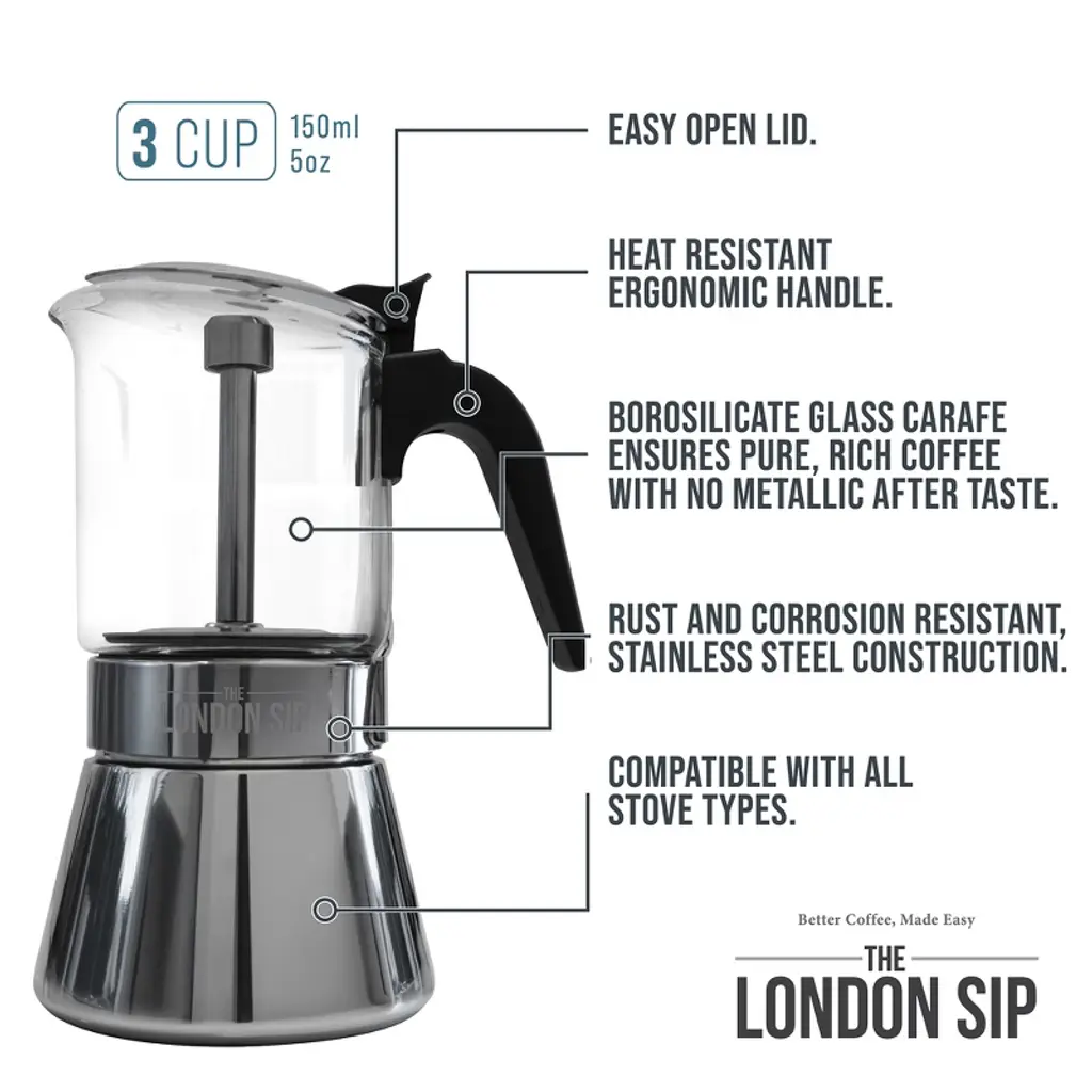 London Sip Stainless Steel Espresso Maker 3-cup, Glass
