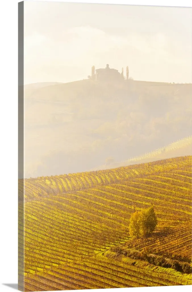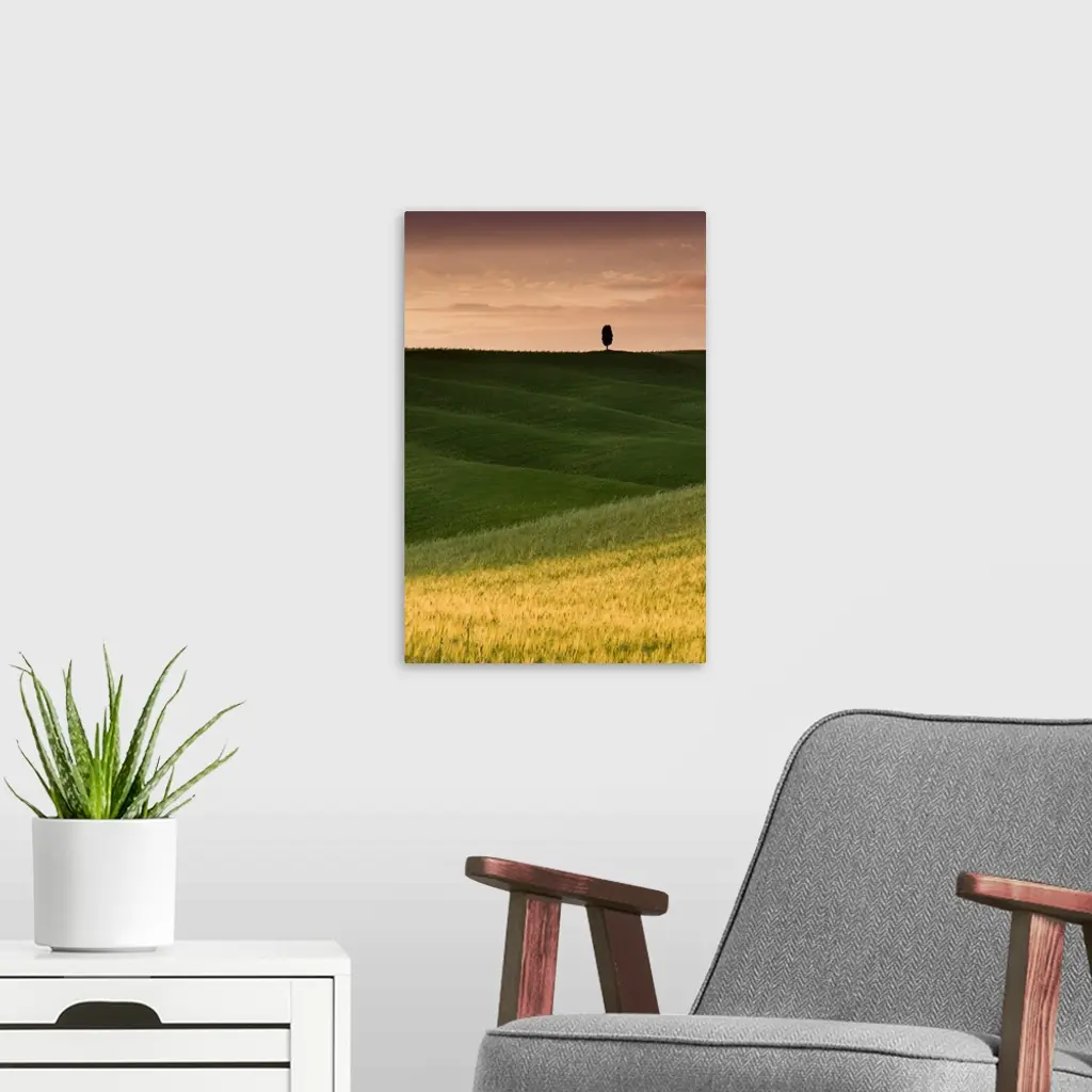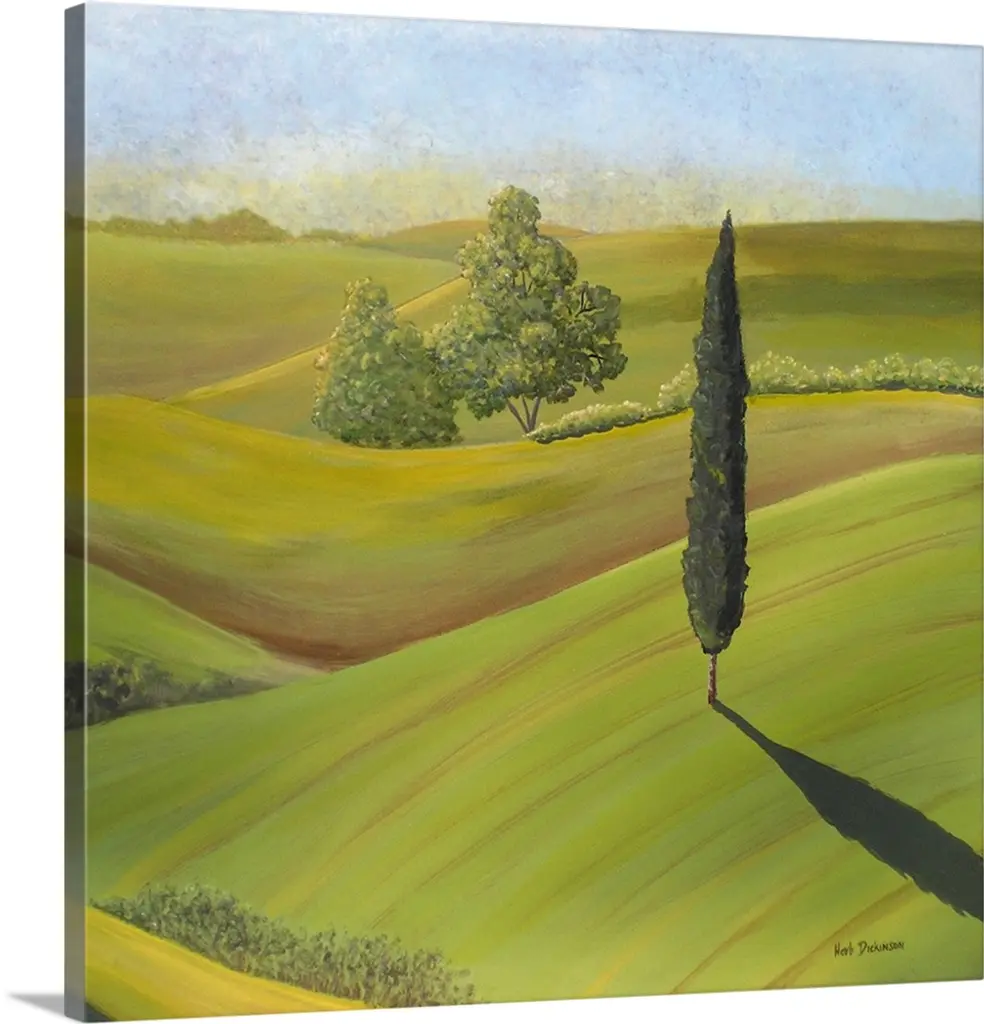 A photograph of a lone cypress tree seen in a Tuscan landscape with rolling green fields.