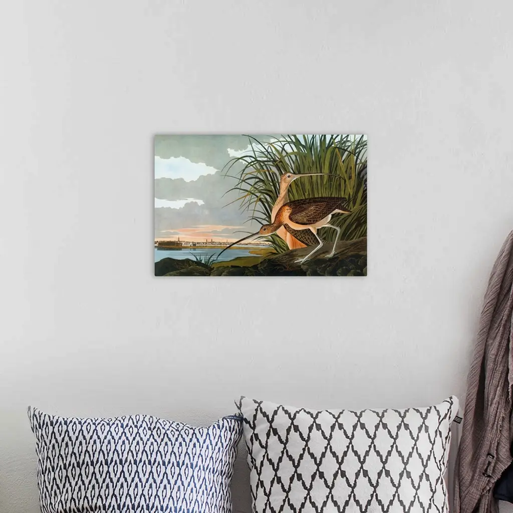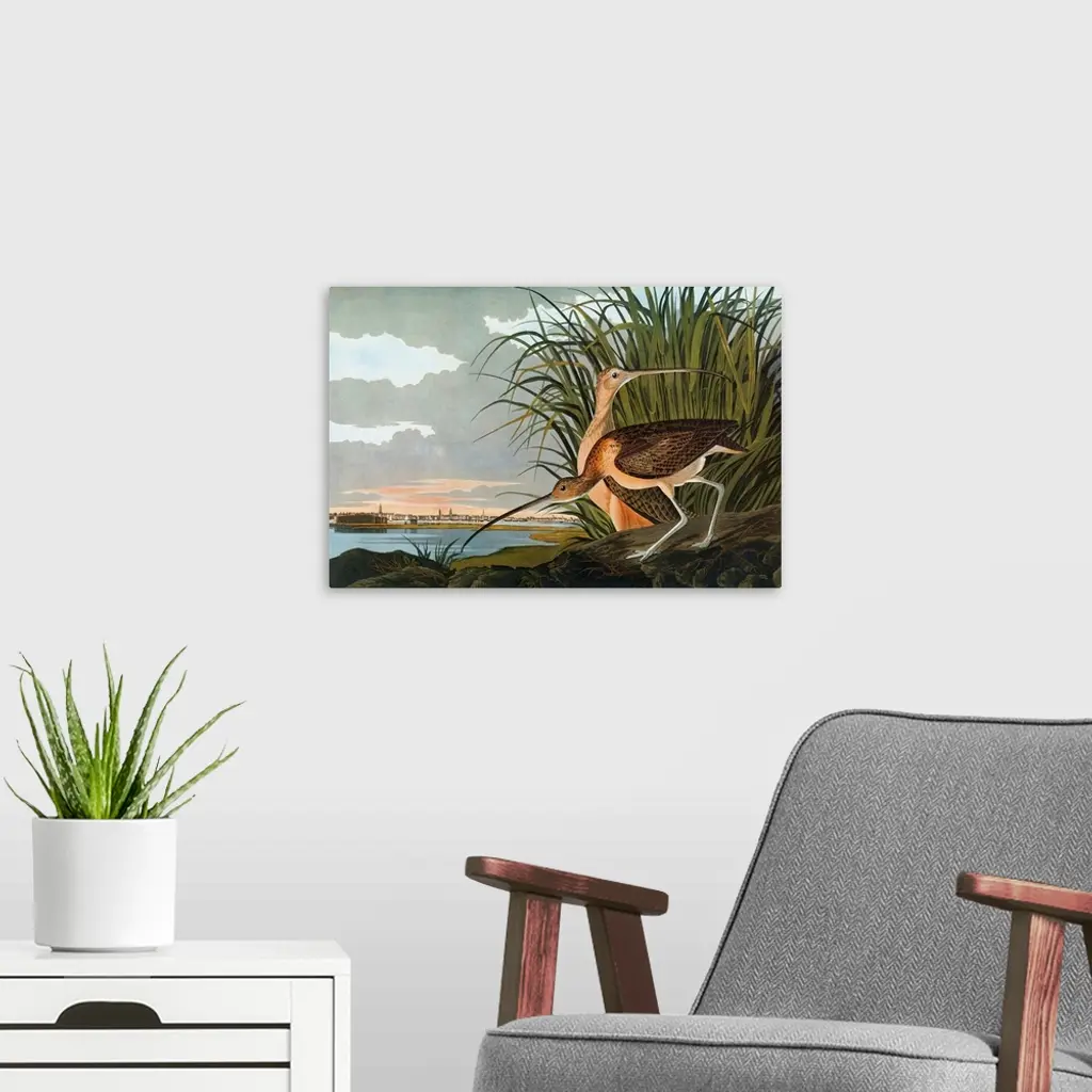 Long-billed Curlew (Numenius americanus), with a view of Charleston Harbor, South Carolina. Engraving after John James Audubon forhis 'Birds of America,' 1827-38.