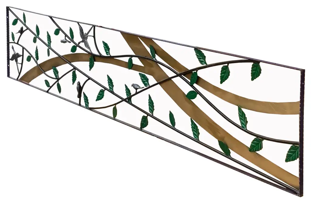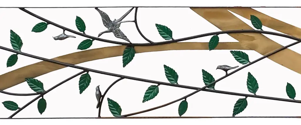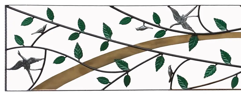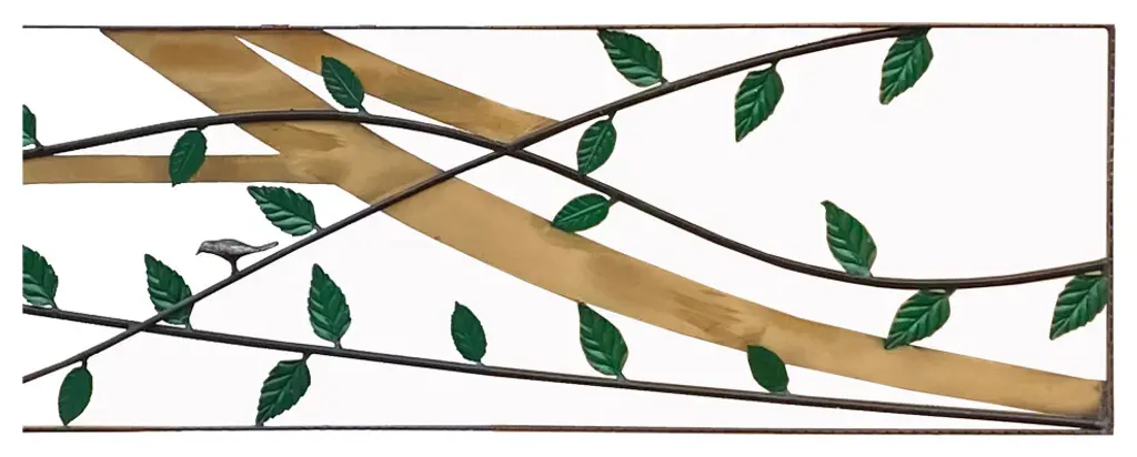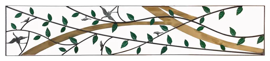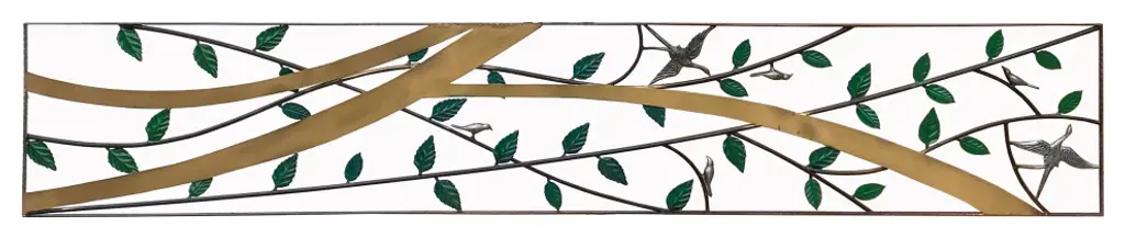 This is a metal frame art / panel with green color leaves and birds pattern in a long rectangular shape. Dimensions: 18" x 95.5" thickness 0.75"Origin: ChinaMaterial: MetalCondition: Quality handmade, minor rustic marks on color and metalUS domestic continental buyer of 48 states pays $380 shipping charge for curbside delivery. Customer from New York, Hawaii, Alaska, US Island, Florida Keywest, and Canada pays extra shipping cost. Insurance and handling charge are already included in the shipping cost. In-store pick-up is highly welcomed if you are in San Francisco Bay Area. (No charge) White-Glove (4-8 weeks transit) service can be arranged with additional cost - needs quotation based on the destination.When your shipment is delivered, carefully inspect the outside of the packaging before the delivery personnel leave. It is important to clearly indicate if there is any visible damage to the packaging or items on the delivery paperwork. Carriers usually do not honor concealed damage claims so it is crucial to clearly indicate any visible damage to the packaging or items on the delivery paperwork.