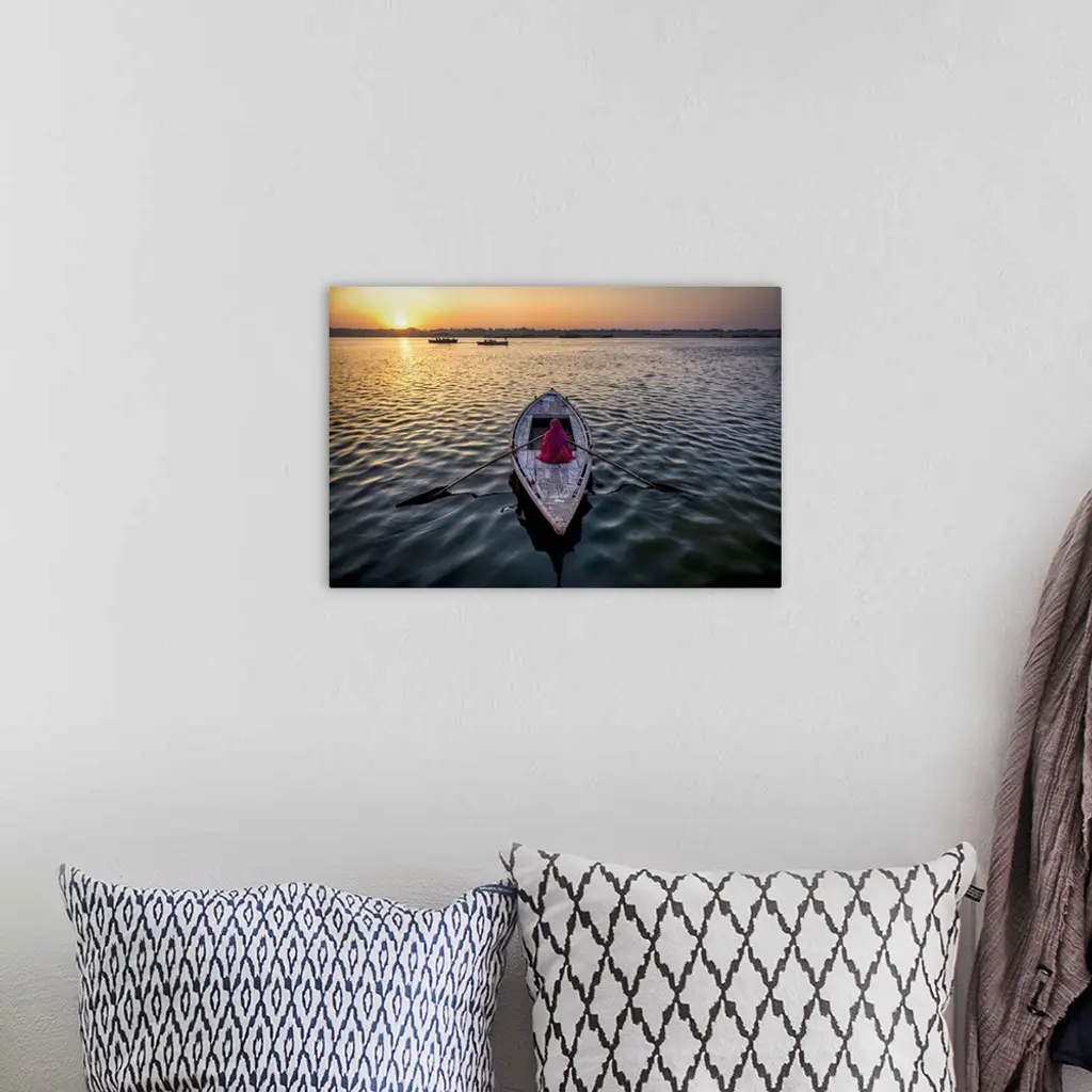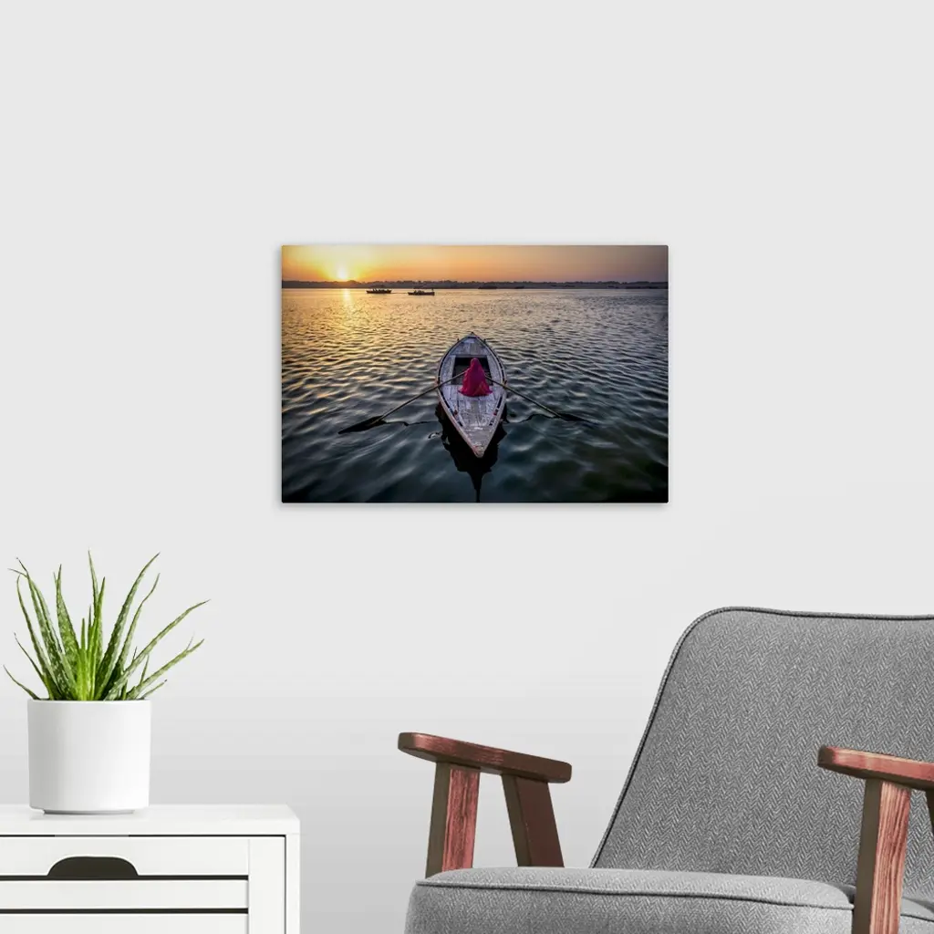 Longtail boat with woman rowing on the Ganges, Varinasi, India at sunrise