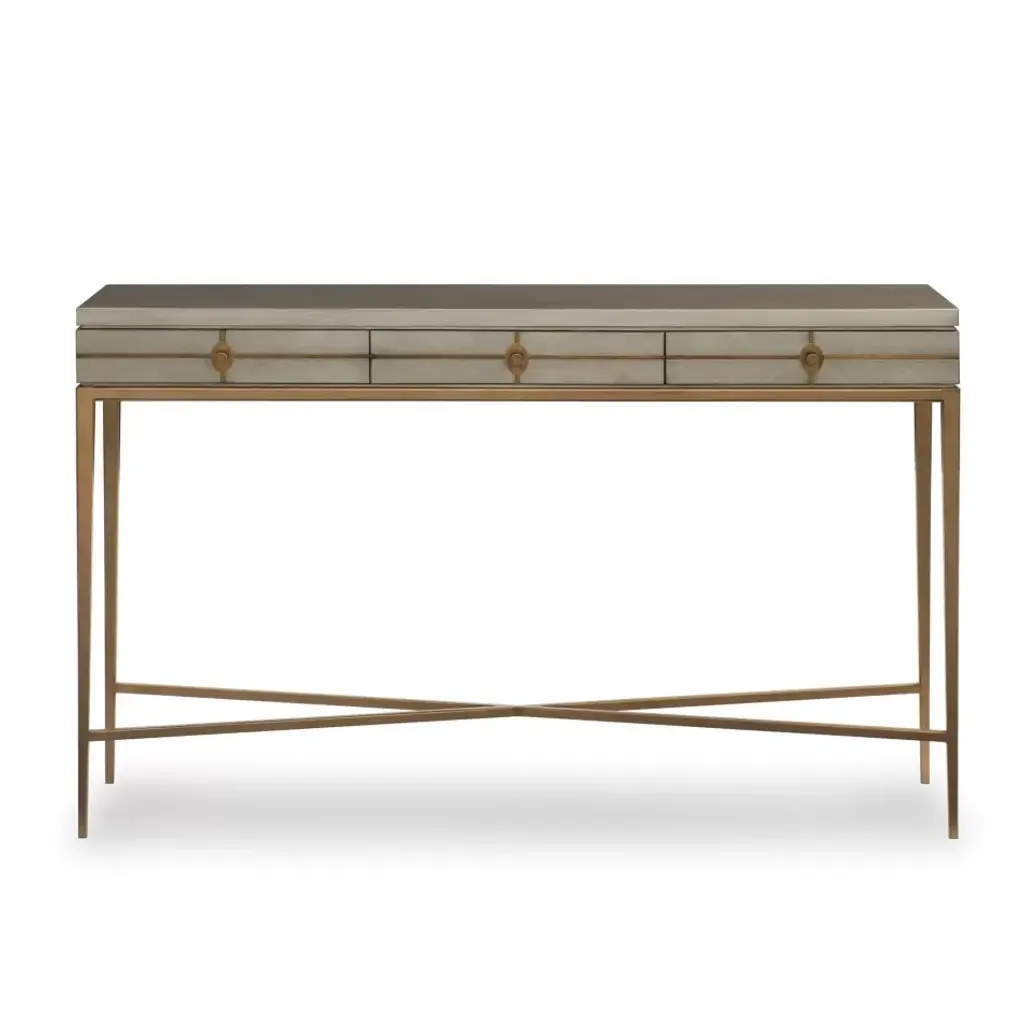 This slender console consists of three drawers raised on tapered brass legs tied together with X stretchers. The drawer fronts are inverted diamond veneer with brass inlay. Complete with brass pulls on an oval plate. A warm grey finish complements the brass acccents.