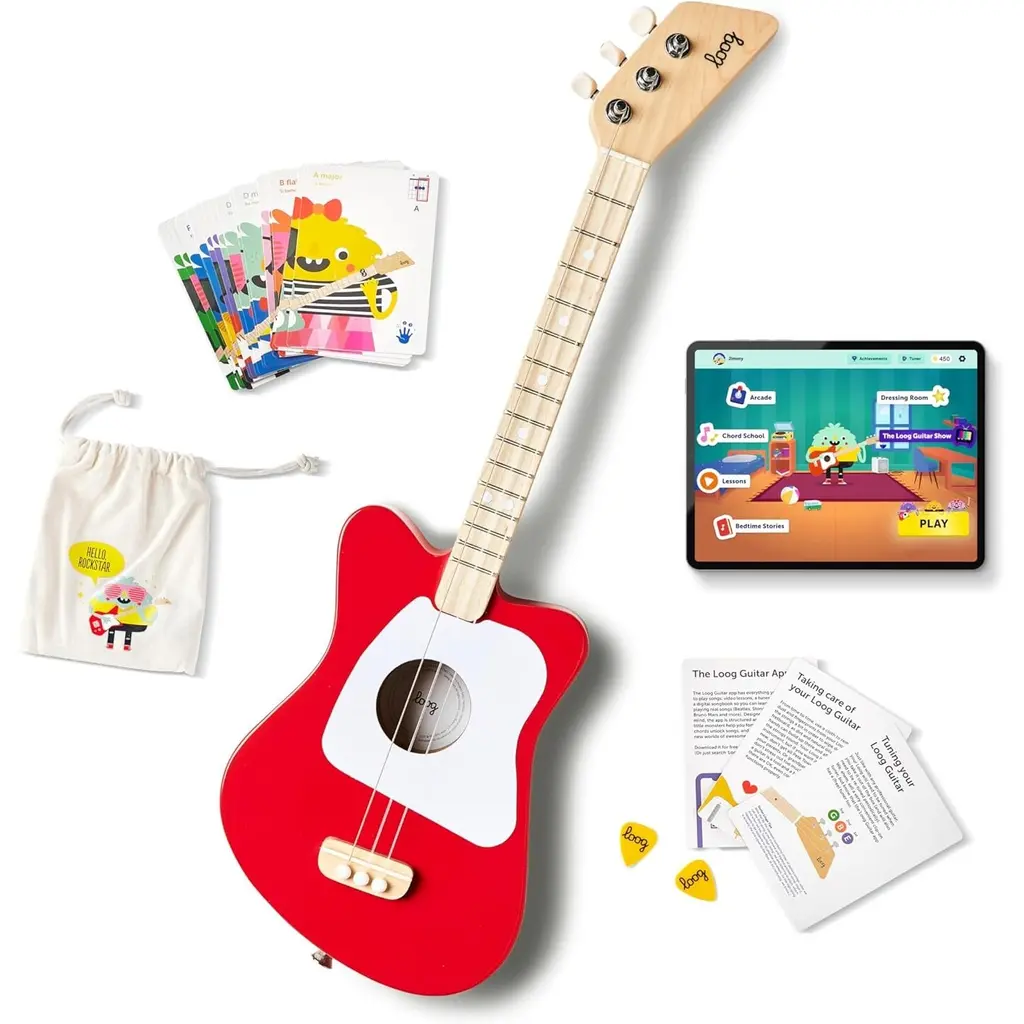 Loog Mini Acoustic Kids Guitar For Beginners 3-Strings Ages 3 & Up Learning App And Lessons Included Red - Red
