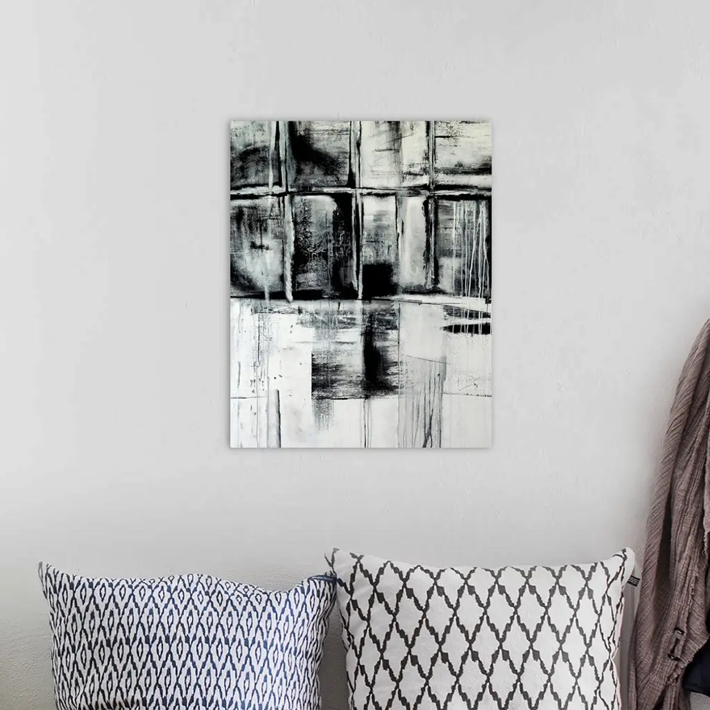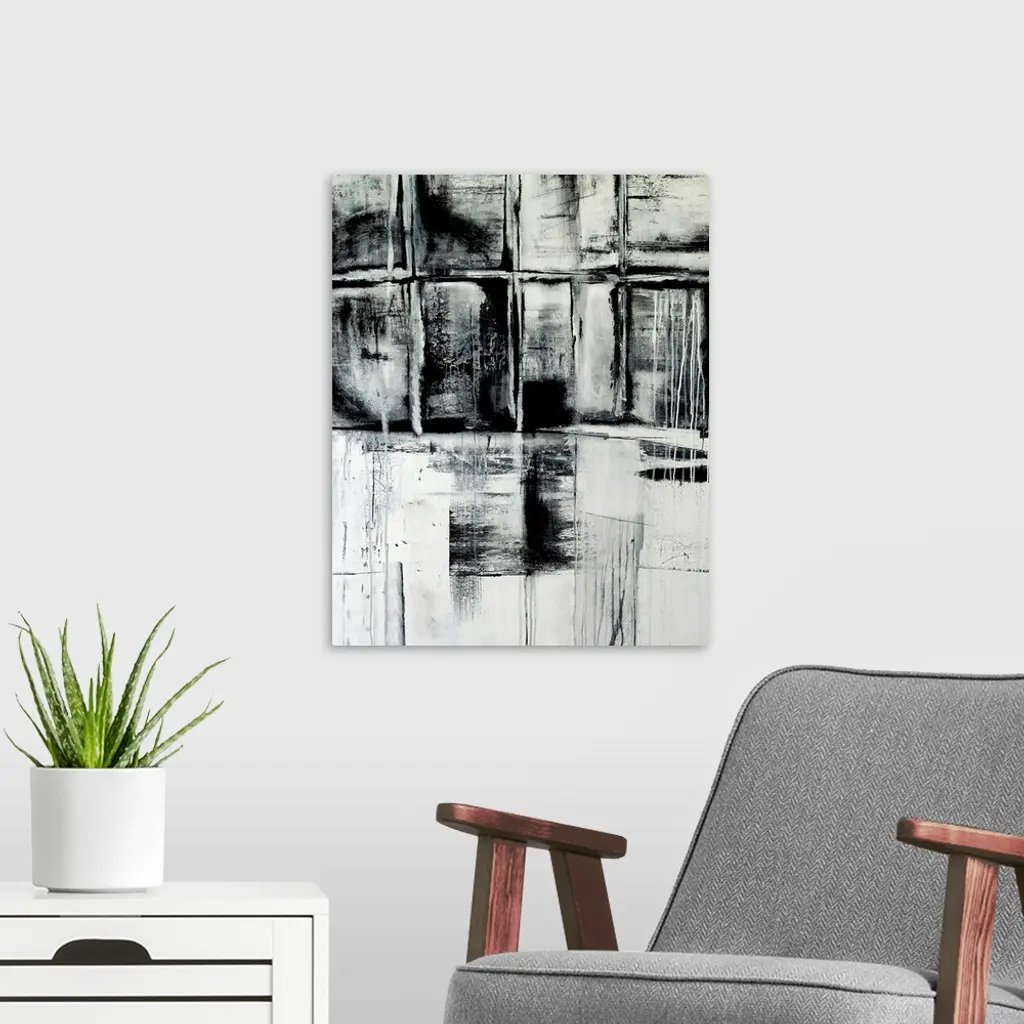 Black and white contemporary abstract art, painted roughly in squares, resembling grungy warehouse windows.