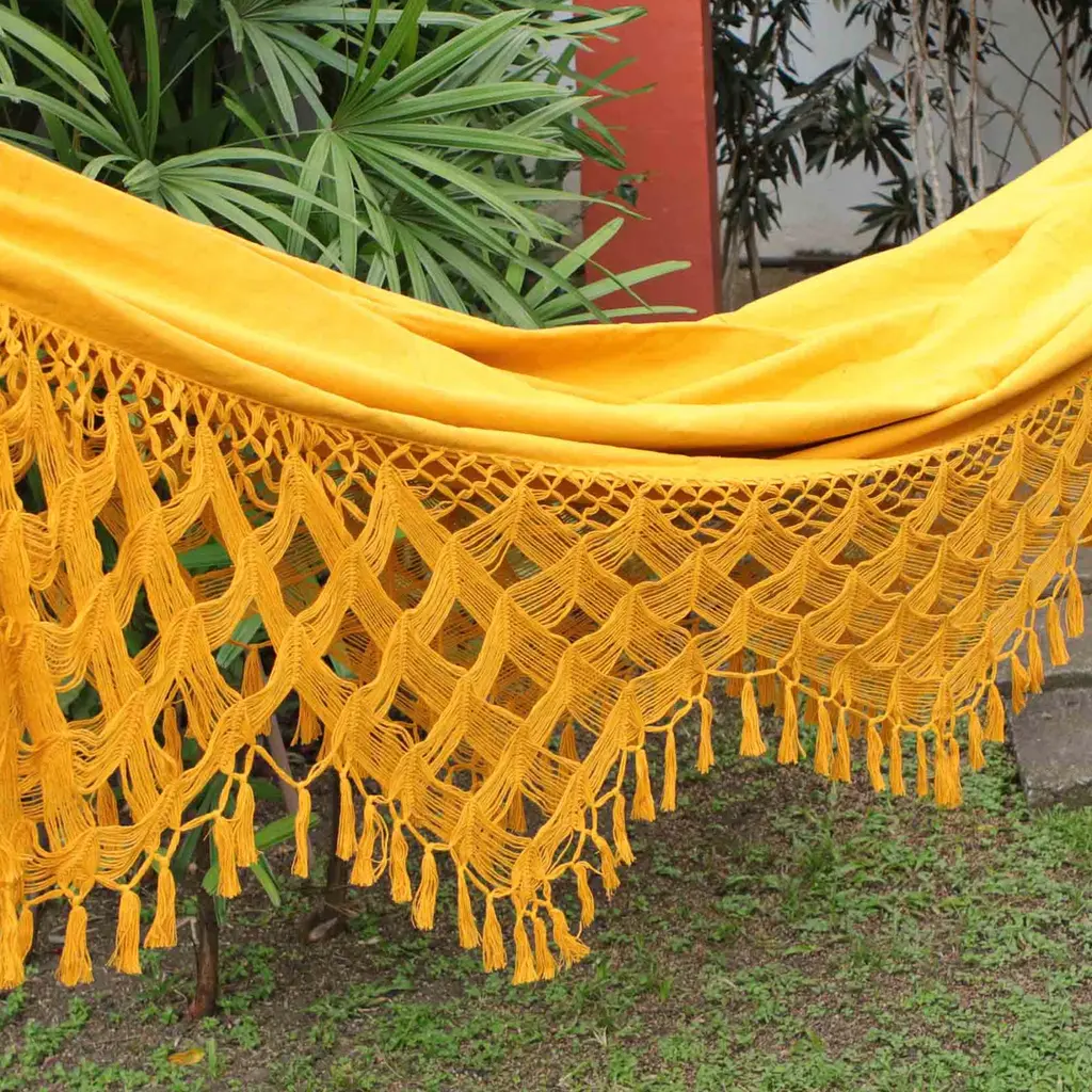 After a long day full of troubles, nothing is better than comfortably resting on a soft surface in the open air, listening to the peaceful sounds of nature. The Hammock Artisans of Ceará, from Brazil, make this divine scenario possible by creating a single hammock with cotton in a gorgeous honey tone and adding crocheted accents at each side, all made in a traditional loom called mamucaba.
