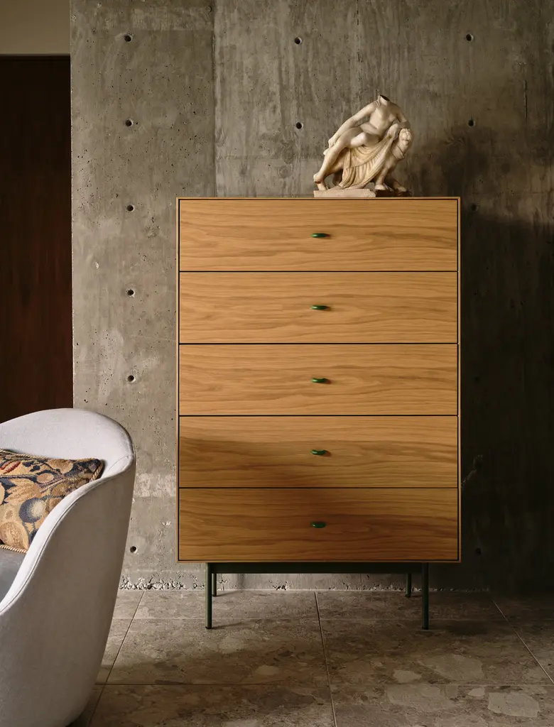 With just a hint of a visible cabinet surrounding the drawers, the Loop Dresser (2020) defies logic, especially when you interact with it and discover its sturdy construction. The frame is slim, but not quite as slim as it appears from the front, where it's been “stepped back," or tapered, to create the appearance of thinness without sacrificing durability. Loop is the work of Rotterdam-based designer and Earnest Studio founder Rachel Griffin, who credits the consistent proportions of the drawers with giving this collection a pleasing visual cadence. Simple loop drawer pulls and crisp mitered edges complete the neatly finished look. Made in Estonia.