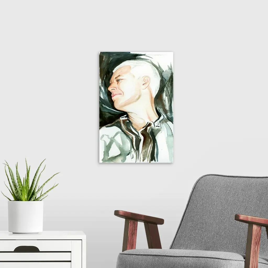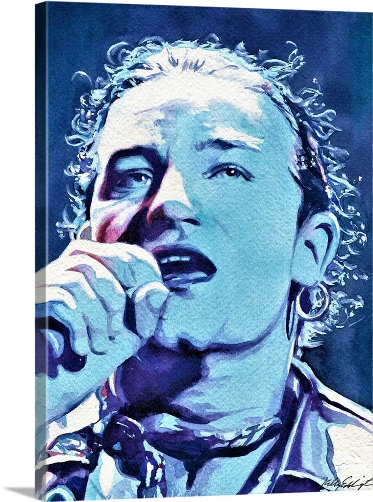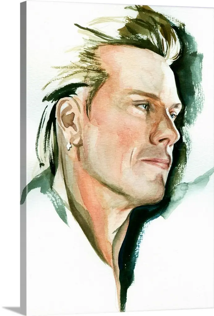 Vertigo-era Adam Clayton in a loose watercolor portrait, one of four band members.