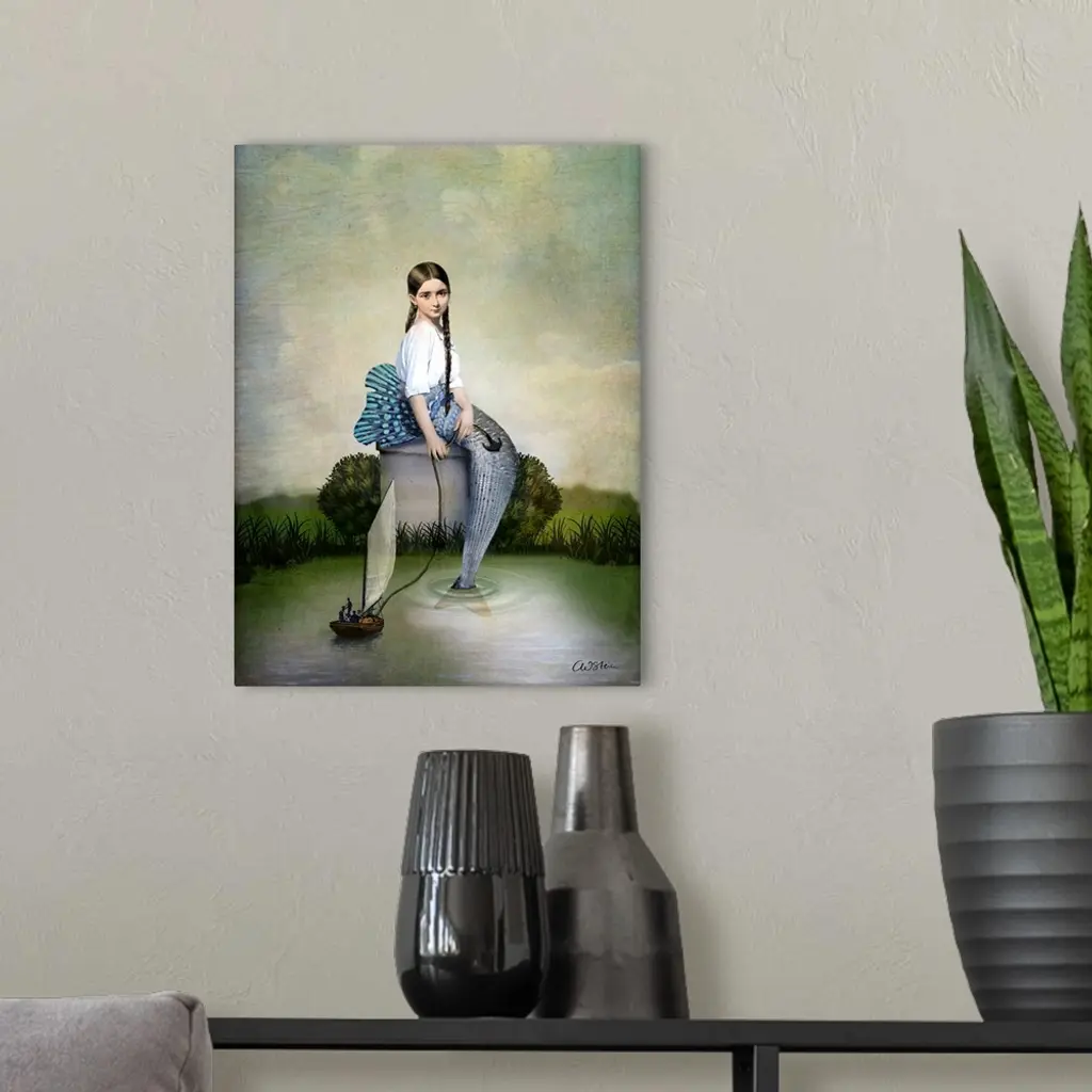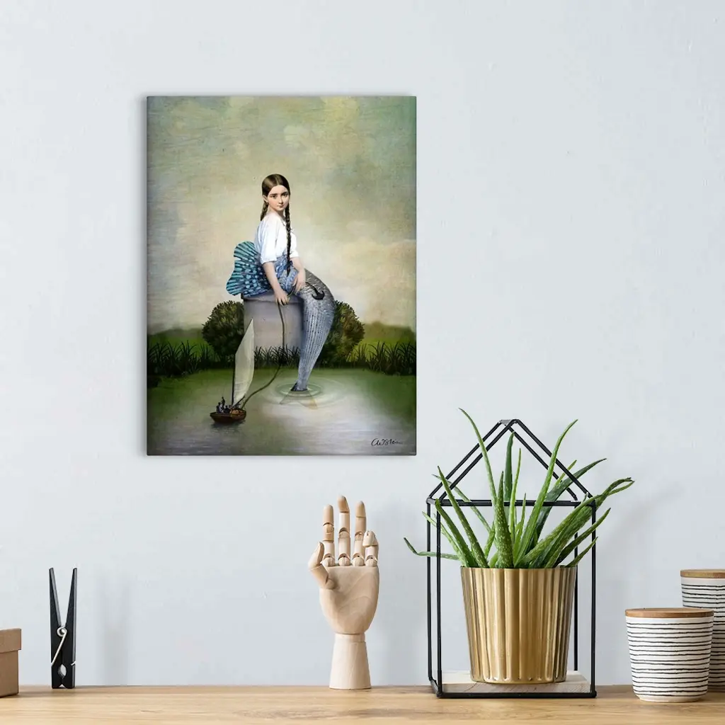 A girl, who is part fish, is pulling on the anchor of a small sailboat in the water.