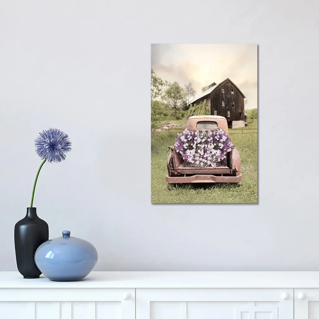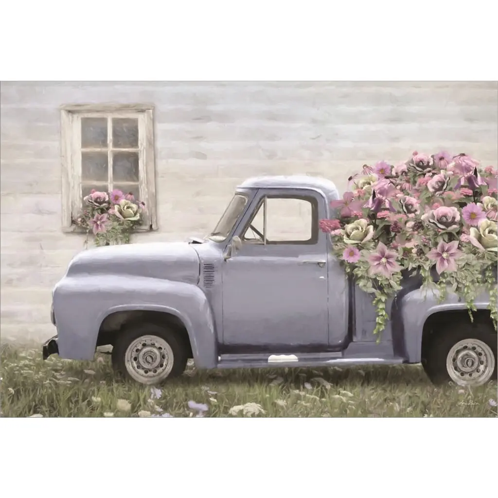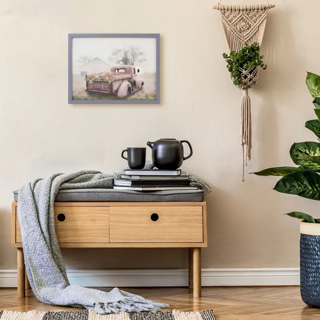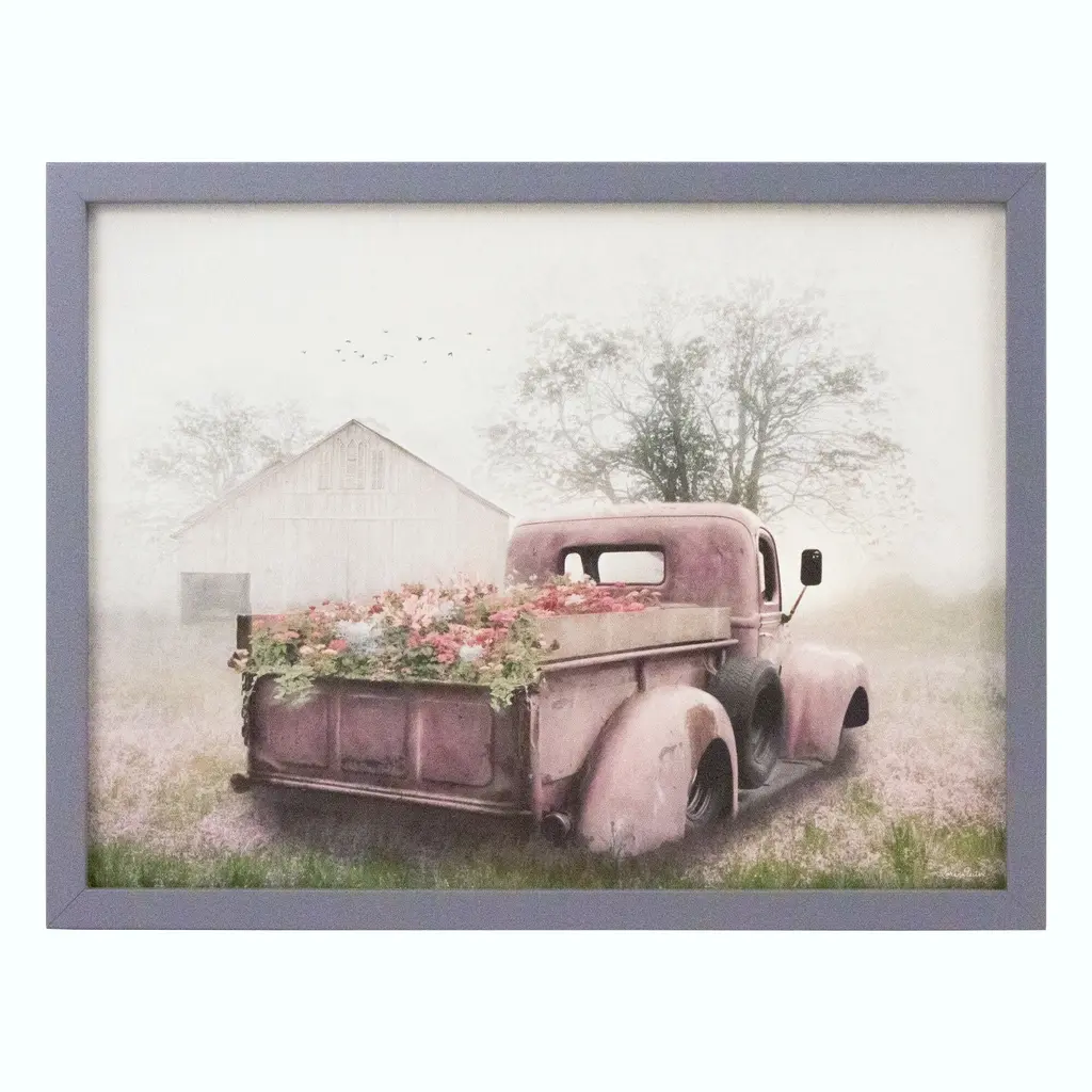 Pink Flower Truck by Lori Deiter is an affordable, high quality piece of framed art. The finished size is 17W x 13H x 1.5D with a gray frame . It has an attached sawtooth hanger for easy installation.