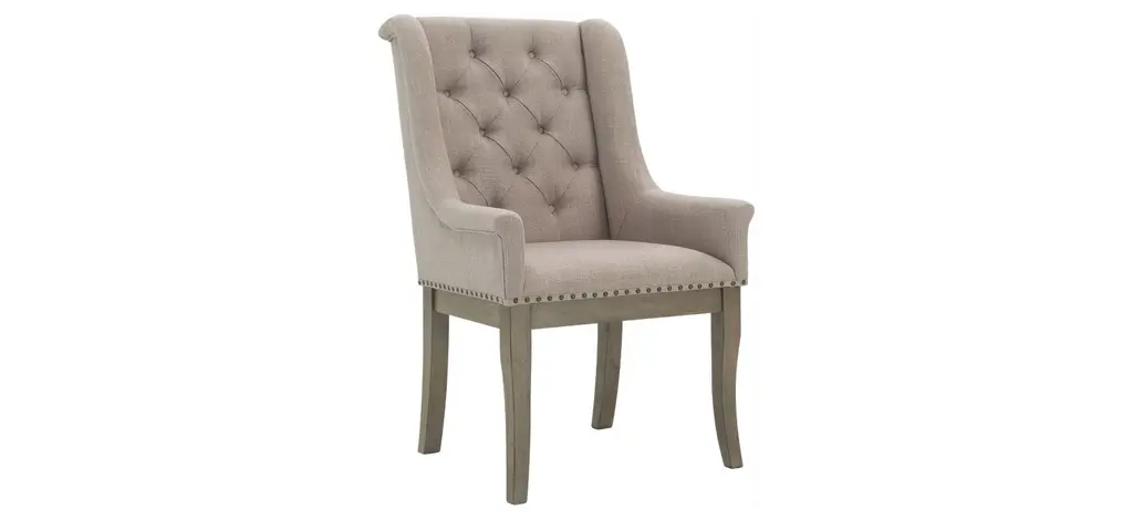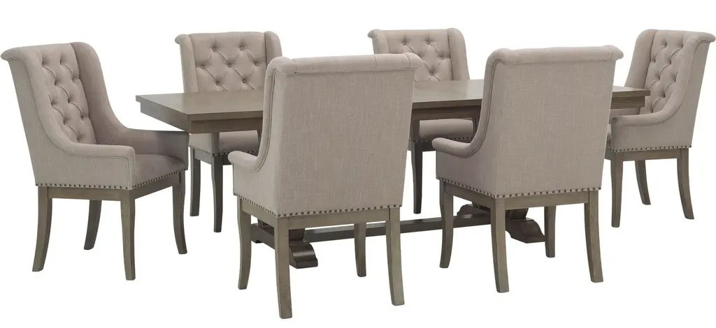 Have splendid gatherings with family and friends around the well-designed Lorient 7-pc. set. From the beautiful oak and poplar finished wood to fine details like nailhead trim and button tufting, this set has it all. Versatile seating options, with upholstered wingback armchairs in a neutral colored fabric provides additional visual interest. Aside from looks, Lorient is functional as well with a 12-bottle removable wine rack in the server and a 20-inch extension leaf that stows away inside the table when you don't need it. Matching Table Protector