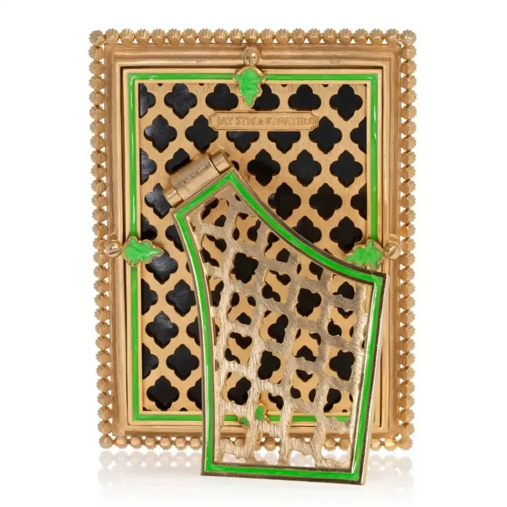 Frame your loved ones with a pop of electric green enamel and jewels ! We created a special edition of our classic Lorraine 4” x 6” frame in a vivid ombre of chrome yellow to lime green enamel bordered in a limited edition of Swarovski electric green crystals. Hand-painted enamels with hand-set crystals on a 14K gold finished metal frame created at the Jay Strongwater Rhode Island workshop. With our signature, fleur-de-lis metal back plate and kickstand – this frame is truly beautiful from any view. Stands vertically or horizontal.