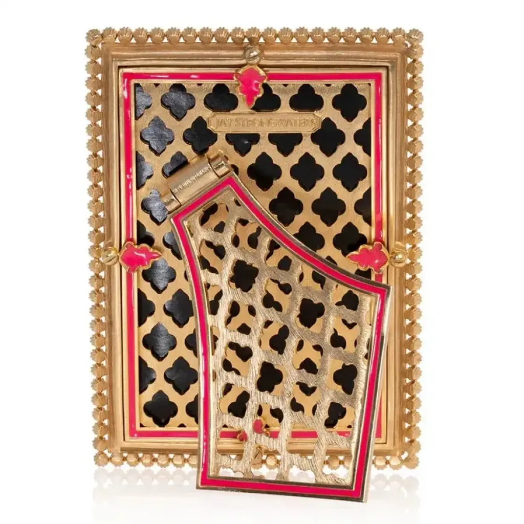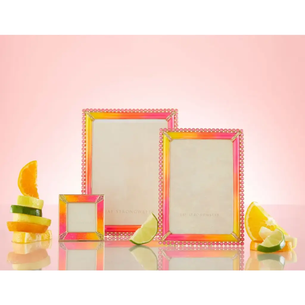 Frame your loved ones with a pop of electric pink enamel and jewels ! We created a special edition of our classic Lorraine 4” x 6” frame in a vivid ombre of sunset to pink enamel bordered in a limited edition of Swarovski electric pink crystals. Hand-painted enamels with hand-set crystals on a 14K gold finished metal frame created at the Jay Strongwater Rhode Island workshop. With our signature, fleur-de-lis metal back plate and kickstand – this frame is truly beautiful from any view. Stands vertically or horizontal.