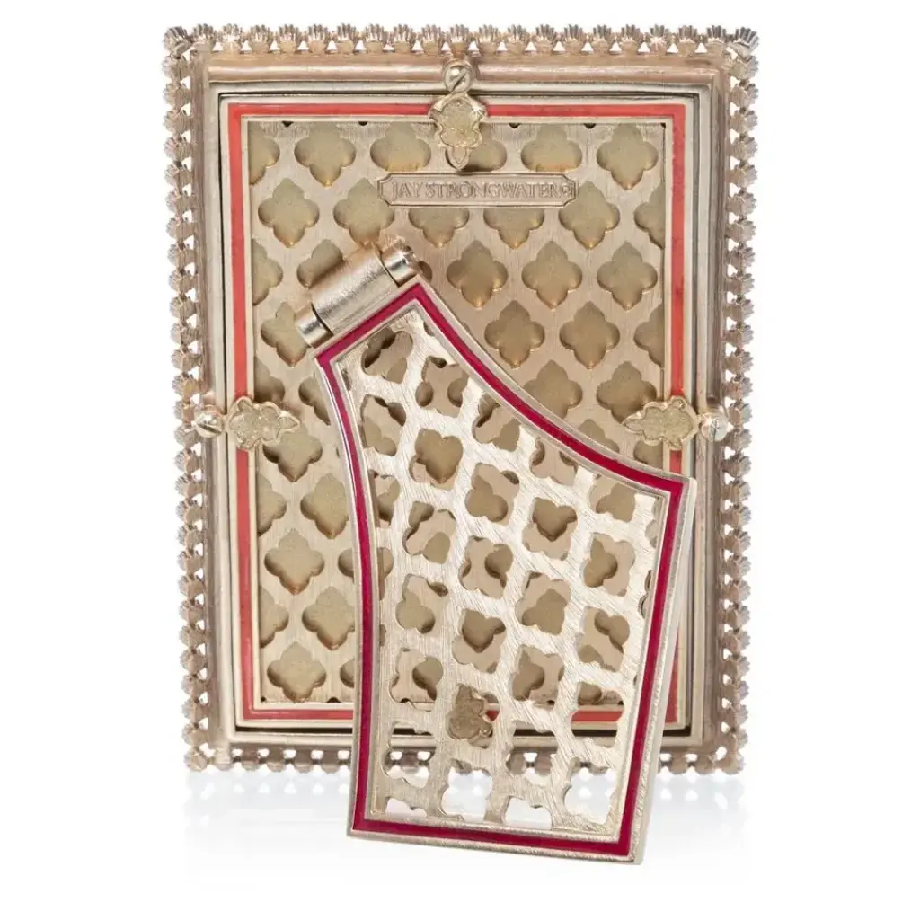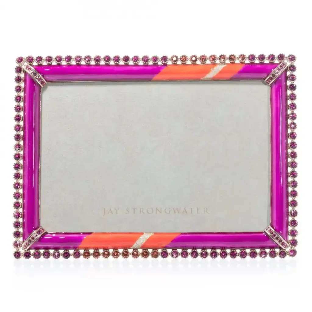 A bold and vibrant addition to any décor. This beautiful frame features a stunning pop art inspired design that is sure to catch the eye. Its edges are adorned with colorful stones and the frame is finished in a brilliant gold tone, giving it an air of luxury and sophistication. The frame is able to hold a 4" x 6" photo and has a velvet backing to protect your cherished memories. With its unique and playful design, this Jay Strongwater frame is the perfect way to showcase your favorite photos in a fun and stylish way. It's the perfect way to add a pop of color and personality to any space, making it a truly wonderful gift for any occasion.